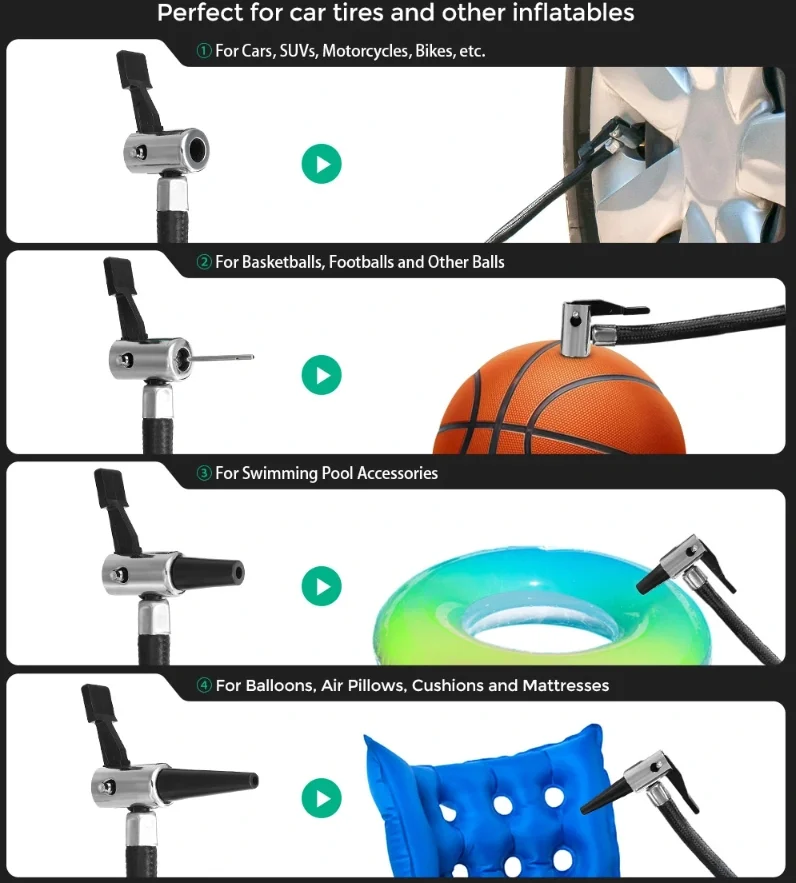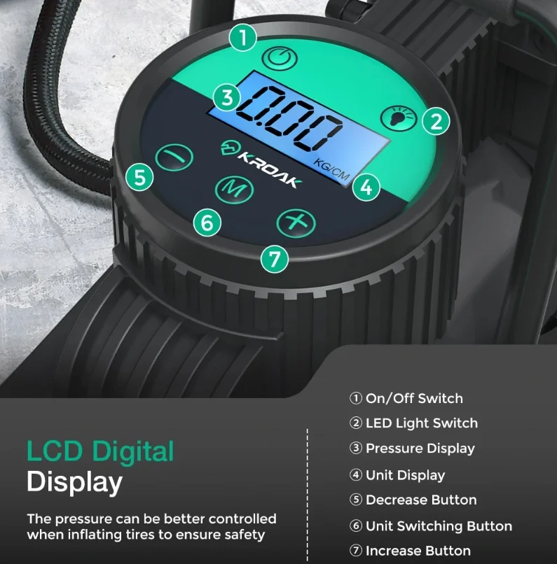 LCD kijelzőn mutatja a nyomásértéket, és gombokkal állíthatjuk be az elérni kívánt nyomást, így a gép addig fúj, ameddig szeretnénk, utána automatikusan lekapcsol. Még egy LED fény is került rá, hogyha éjszaka használnánk, akkor is lássunk valamennyit. Négyféle fejet adnak hozzá, van a sima autós csatlakozó, a tűszelepes végződés és két méretben olyan, ami a strandcuccokhoz kell.