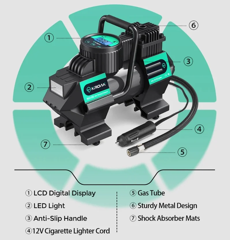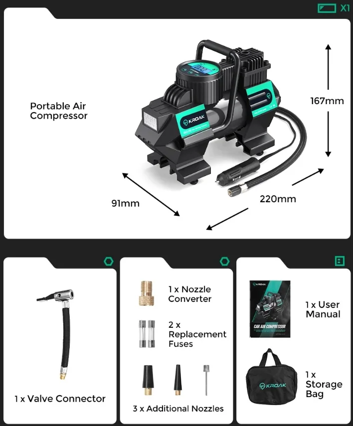 Akik nem szeretnek a benzinkúton kereket fújni, vagy másra is használnának egy kompresszort, azok számára lehet remek ajánlat a Kroak TP04 akció. A gép szivargyújtóról működik, és elsődlegesen a kocsi kerekének felfújására találták ki, azonban nemcsak erre az egy felhasználási módra tökéletes. Fújhatunk vele bicikligumit, gumicsónakot, medencét, SUP-ot vagy éppenséggel focilabdát is. A légszállítása 26 liter percenként és maximum 150 PSI-re (10 barra) képes pumpálni.