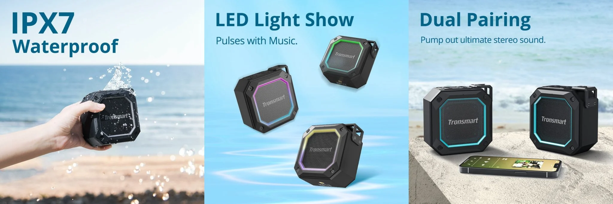 A tetején találjátok a vezérlőgombokat, elöl pedig a logó körül egy mutatós LED csík található. Ez a modell is megkapta a már jól ismert TWS üzemmódot, vagyis könnyedén párosíthattok két készüléket, így megduplázhatjátok a teljesítményt. Egy töltéssel körülbelül 18 órán át használhatjátok, tölteni pedig Type-C kábellel tudjátok. IPX7-es minősítésének köszönhetően nem esik gondja, ha kint marad az esőben vagy leöntitek üdítővel.