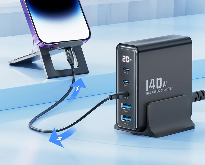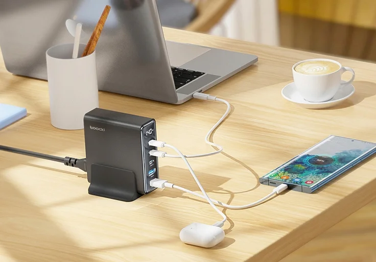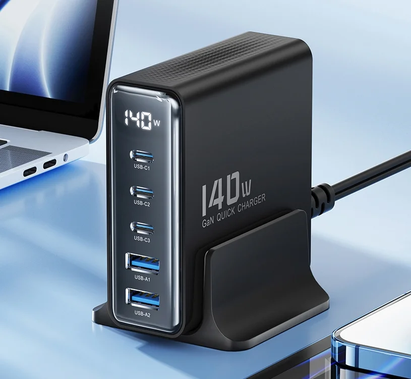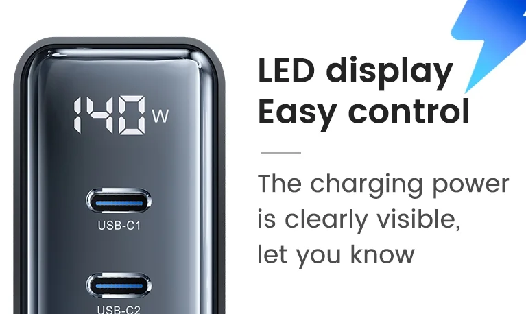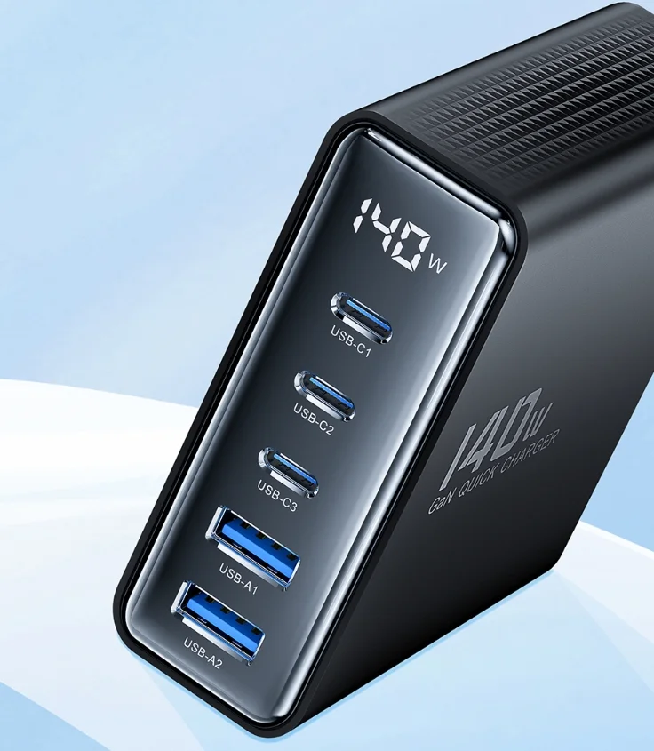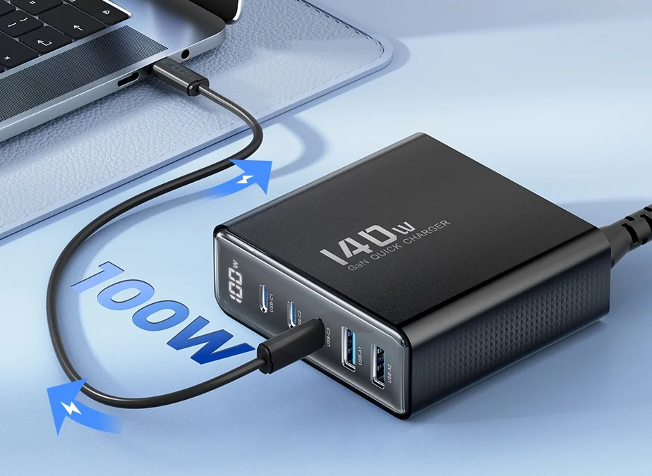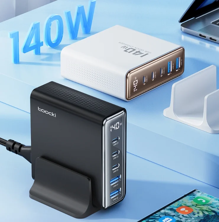 A legjobb Toocki töltőnek a maximális teljesítménye 140 watt, ami még úgy is elégséges, ha egyszerre 3-4 eszköz osztozik ezen a teljesítményen. Ttartozik hozzá egy másfél méter hosszú kábel, azzal kell a fali csatlakozóba dugni, így a töltőt az asztalunkra is állíthatjuk. Öt port került rá, amiből három darab USB Type-C, kettő pedig hagyományos USB. Az előbbieken egyenként 100 wattot tud leadni és természetesen mind PD kompatibilis. A sima USB csatlakozók se semmik, hiszen 60 watt még azokon is megy. A tetején található egy LCD kijelző, ami mutatja az aktuális töltési teljesítményt.