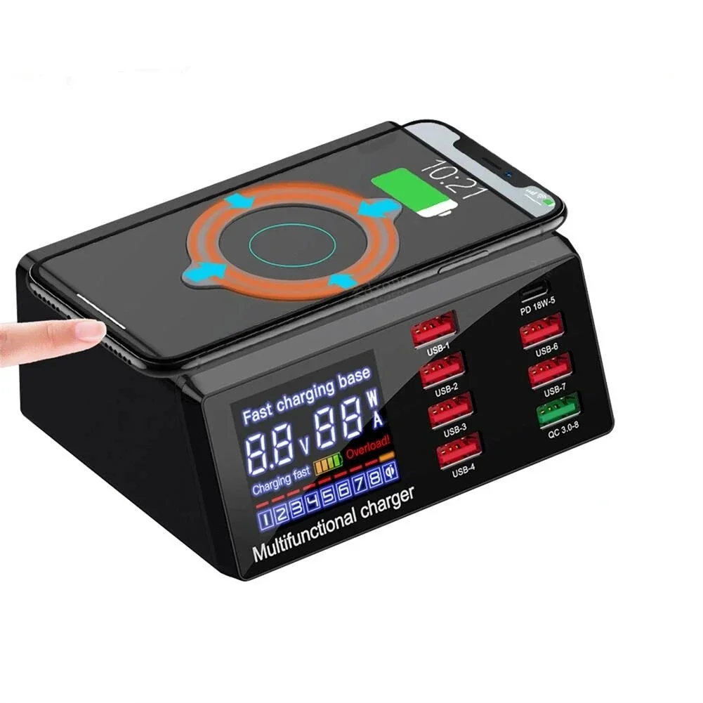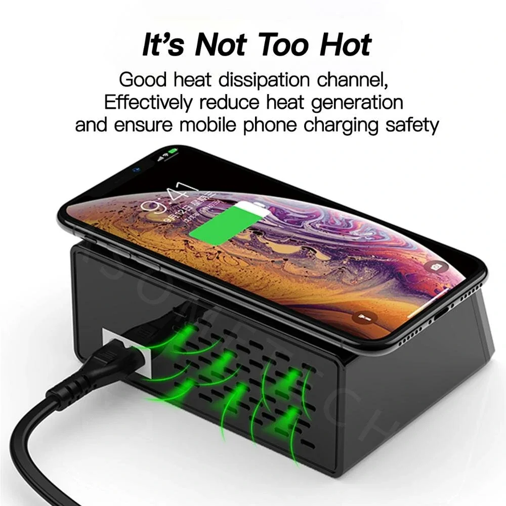 Milyen egy jó töltőállomás? Legyen rajta sok-sok csatlakozó, a Bakeey eszközén ebből 7 USB és egy Type-C található. Tudjon gyorsan tölteni, ez is pipa, hiszen a felsoroltakból hat 2,4 amperrel tölt, a hetedik pedig 3 amperrel, míg a Type-C csati pedig 18 wattal küldi az elektronokat. Az már csak hab a tortán, ha a töltőállomáson van kijelző is, amin pontos információkat kaphatunk az aktuális töltési teljesítményről csatinként. Ha még a gépezet vezeték nélküli töltésre is alkalmas az már tényleg extra, itt erre is van lehetőség, ebből is a 10 wattos változat elérhető. A tervezéskor gondoskodtak, hogy a készülék ne melegedjen túl akkor sem, amikor az összes porton lóg egy fogyasztó, valamint a vezeték nélküli töltés is gőzerővel üzemel.