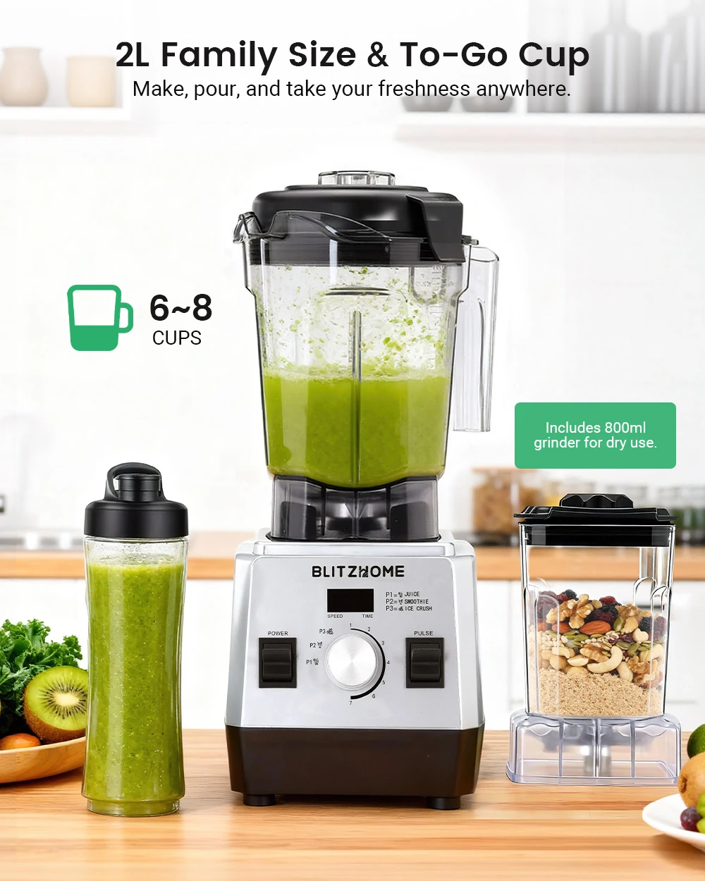 A vezérlés is a te kezedben van: a 7 fokozatú sebességszabályzó tárcsával milliméterpontosan beállíthatod a kívánt állagot, de ha a kényelmet választanád, három dedikált program (lé, smoothie és jégkása) áll rendelkezésedre, hogy egy gombnyomásra profi eredményt kapj. A tervezésnél a biztonság és a tisztaság sem maradt el: minden élelmiszerrel érintkező alkatrész BPA-mentes, élelmiszeripari PC anyagból készült, így a család legkisebb tagjainak is bátran készíthetsz benne bébiételt.