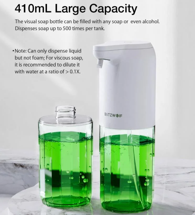 A BlitzWolf eddigi szappanadagolói valójában habszappant nyomtak a kezünkre. Ez a megoldás széleskörben elterjedt, és nem is rossz, a probléma csak annyi vele, hogy sok felhasználó nem hígította vízzel a szappant, így tönkre is tette rögtön a készüléket. Az új kütyüvel ebbe a hibába nem eshetünk bele, mert ez egy az egyben azt tolja ki magából, amit beletettünk. Legyen az folyékony szappan vagy akár alkoholos kézfertőtlenítő. A tartálya elég nagy, 410 ml fér bele, ez körülbelül 500 adagnak felel meg.