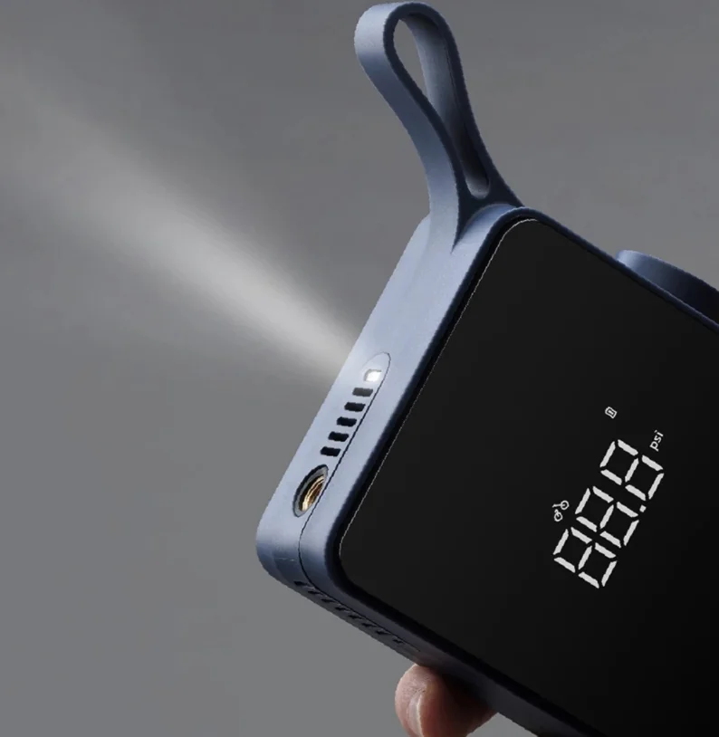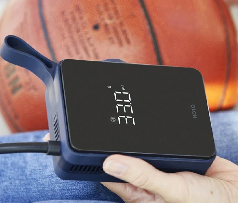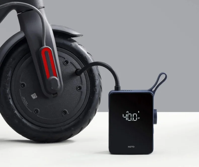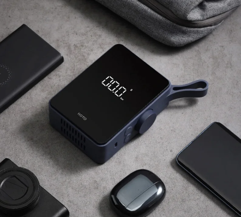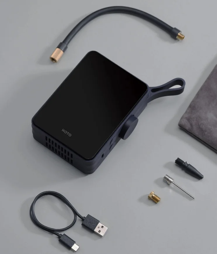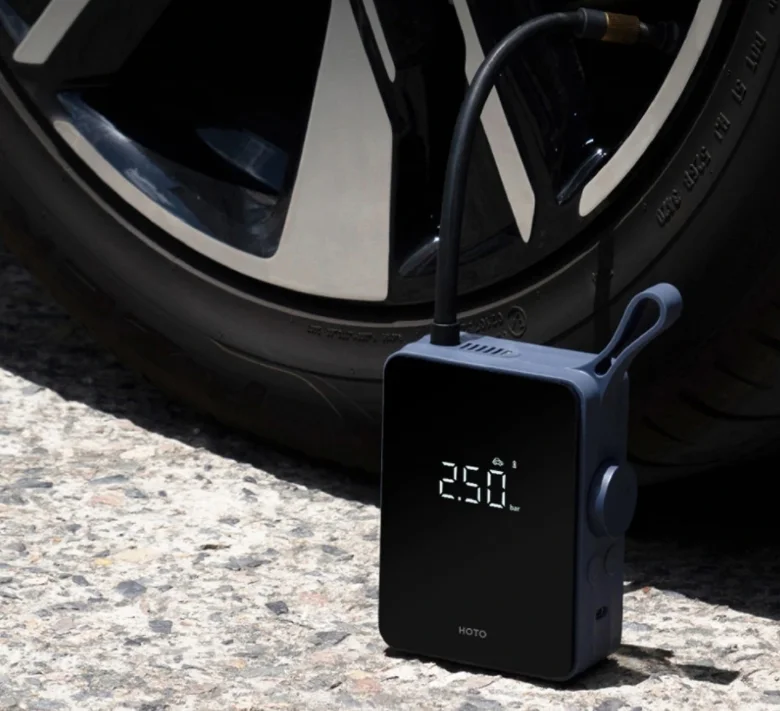 A Hoto mini kompresszora a kinézetet illetőleg nagyon jól sikerült. A tenyérnyi eszköz gumiborítást kapott az oldalán, elől pedig fényes a felülete, ahol a kijelzője is található. Az akasztóját egybeöntötték a készülék házával, ami egy meghatározó dizájnelem rajta, de hasznos is. A kezelőszervek az oldalára kerültek, látunk rajta két nyomógombot és egy tekerőgombot is. A kívánt nyomás mértékét előre beállíthatjuk neki, és egy gombnyomással automatán fel is pumpál addig, majd magától leáll. A beépített akkumulátorának köszönhetően bárhol használhatjuk, ha pedig lemerült, akkor Type-C porton keresztül tudjuk újratölteni. Egy átlagos méretű, üres autókereket 8,5 perc alatt fúj fel, de mivel ritkán kell ilyet csinálnunk, így a kisebb után fújások sokkal kevesebb időbe telnek vele. A nyomásértékeket barban és psi-ben is meg tudja jeleníteni.