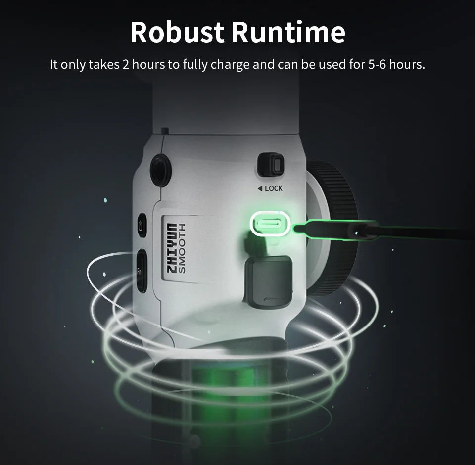 A Zhiyun Smooth 5S szerencsére egy egész nagy aksit kapott, ami 5-6 óra folyamatos használatot bír ki, majd ha lemerült, 2 óra alatt teljesen feltölthető Type-C porton keresztül. Ugyan elérhető fehér és fekete színben is, Banggoodon viszont most csak az utóbbi kapható, de legalább egy majdnem teljesen fullos, kiegészítőkkel tűzdelt pakk is választható.