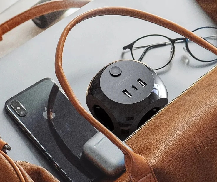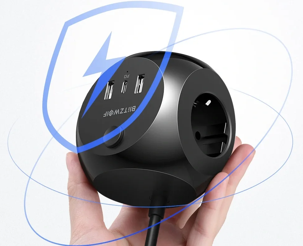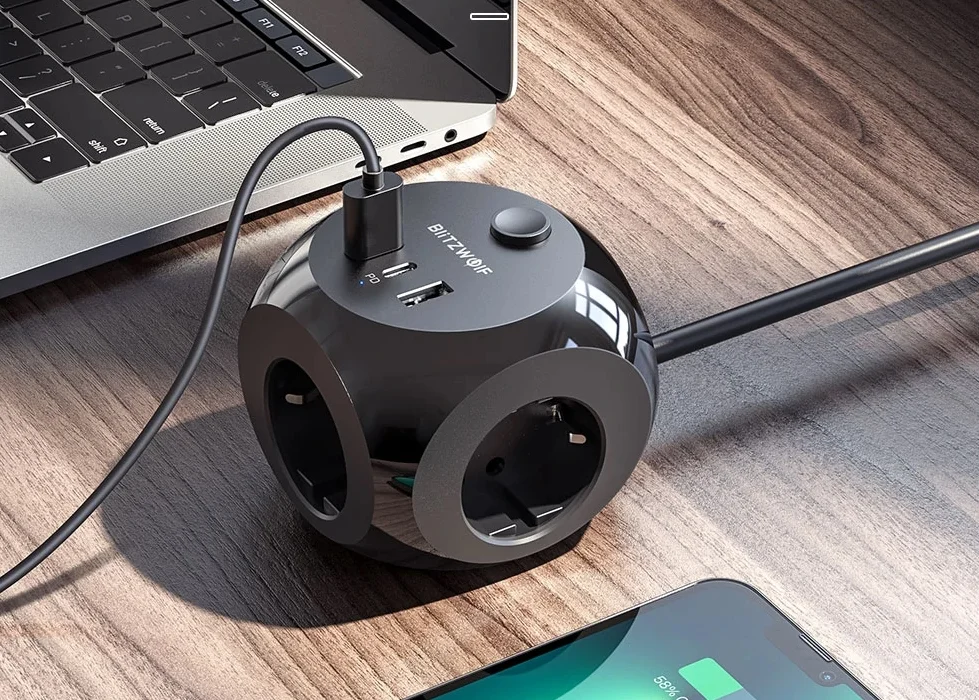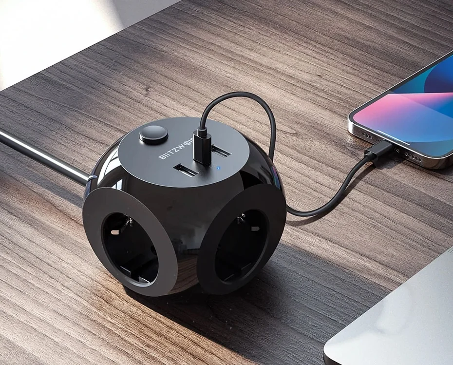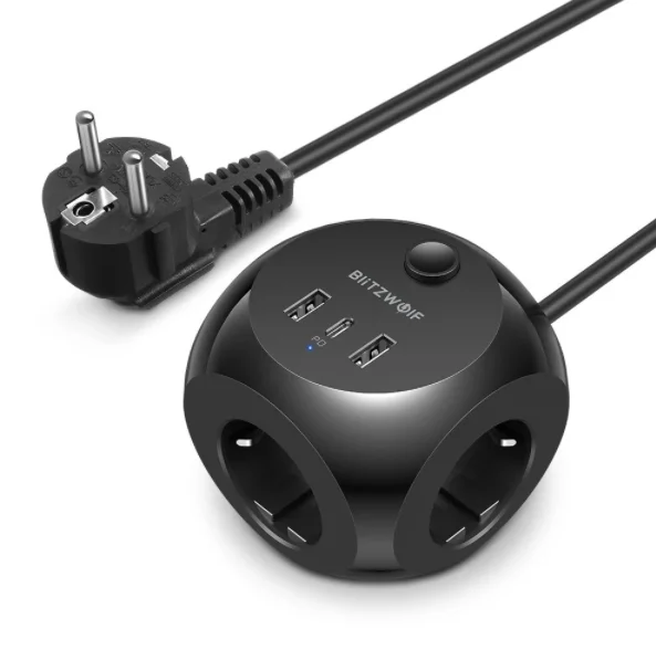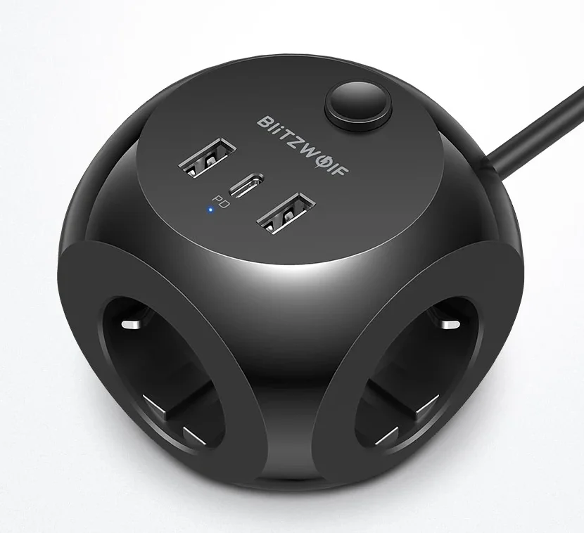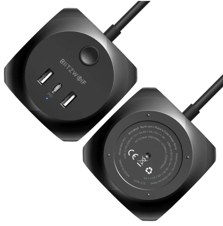 A BlitzWolf BW-PC1 egy elég szofisztikált hálózati elosztó, tehát akár asztalinak is lehetne hívni. Nincs is hosszú kábele, 1,5 méternyi „zsinór” tartozik hozzá, aminek a végén földelt EU csatlakozó található. Maga az elosztó szabályos kocka alakú, és három oldalára került egy-egy 230 V-os dugalj. A tetejének mondható oldalon egy bekapcsológombot fedezhetünk fel, amivel könnyedén áramtalaníthatjuk az elosztót, valamint a három darab USB portot. Kettő USB-A port van rajta, amik 18 wattos töltésre képesek, és van egy Type-C portja is, ami pedig 20 wattos PD töltést tud. Az egész elosztó egyidejű terhelhetősége 2500 watt.
