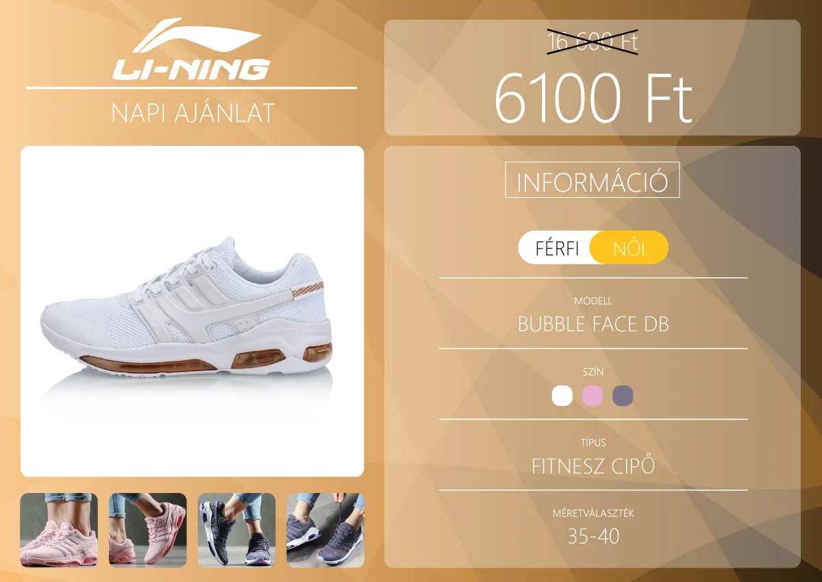 Folytatódik az előző heti sor, amikoris a Li-Ning Official Store napi akcióiban csupa női csuka volt akciós. A hétfőt is egy hölgyeknek készült cipellővel indították, ami jelentősen olcsóbb, mint eddig volt. Ez egy kifejezetten drága cipő a márka kínálatában, de most csak 6100 forint, ami már nagyon kecsegtető ár. Méret- és színválaszték is bőven akad, de ne feledjük, hogy a milliméter alapú méretezést kell figyelembe venni rendelésnél. Az AliExpressen egyébként ma kezdődött a Trend Spotting promóció, így annak a keretében is vannak még akciós lábbelik és egyebek.
