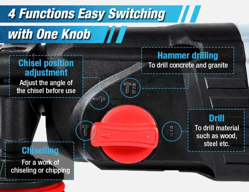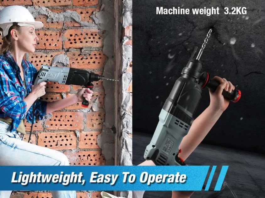 Elektromos meghajtású a gép, 800 watt teljesítménnyel, 2,4 J ütési energiával és akár 4300 percenkénti ütésszámmal rendelkezik. Viszonylag súlyos darab, 3,2 kilogrammot nyom. Természetesen elöl is rendelkezik markolattal, aminek a szöge változtatható. A gép leginkább igazító vésésre alkalmas, biztos nem ezzel fogjuk lebontani az atombunkereket, de vakolat, csempe vagy kisebb falvésésekre, betonba fúráshoz tökéletesen alkalmas lehet.