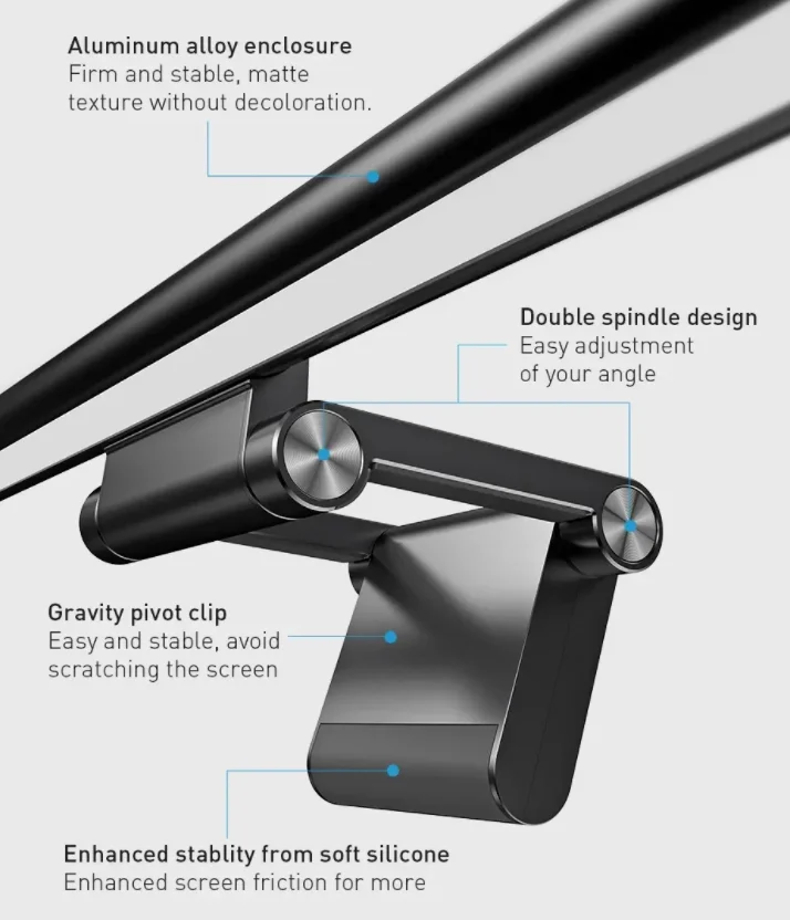 A Baseus lámpáját egy mozdulattal fel lehet helyezni a monitor tetejére és egy Type-C porton keresztül táplálhatjuk meg árammal. Így egy telefontöltő, powerbank vagy egy számítógépen lévő USB csatlakozó is megfelel erre a célra. A fényereje fokozatmentesen állítható az oldalára helyezett potméter segítségével, valamint a színhőmérsékleten is változtathatunk három lépcsőben. Memóriafunkcióval rendelkezik, ami annyit tesz, hogy a következő bekapcsoláskor ugyanabban az üzemmódban kapcsol be, amiben utoljára üzemelt.
