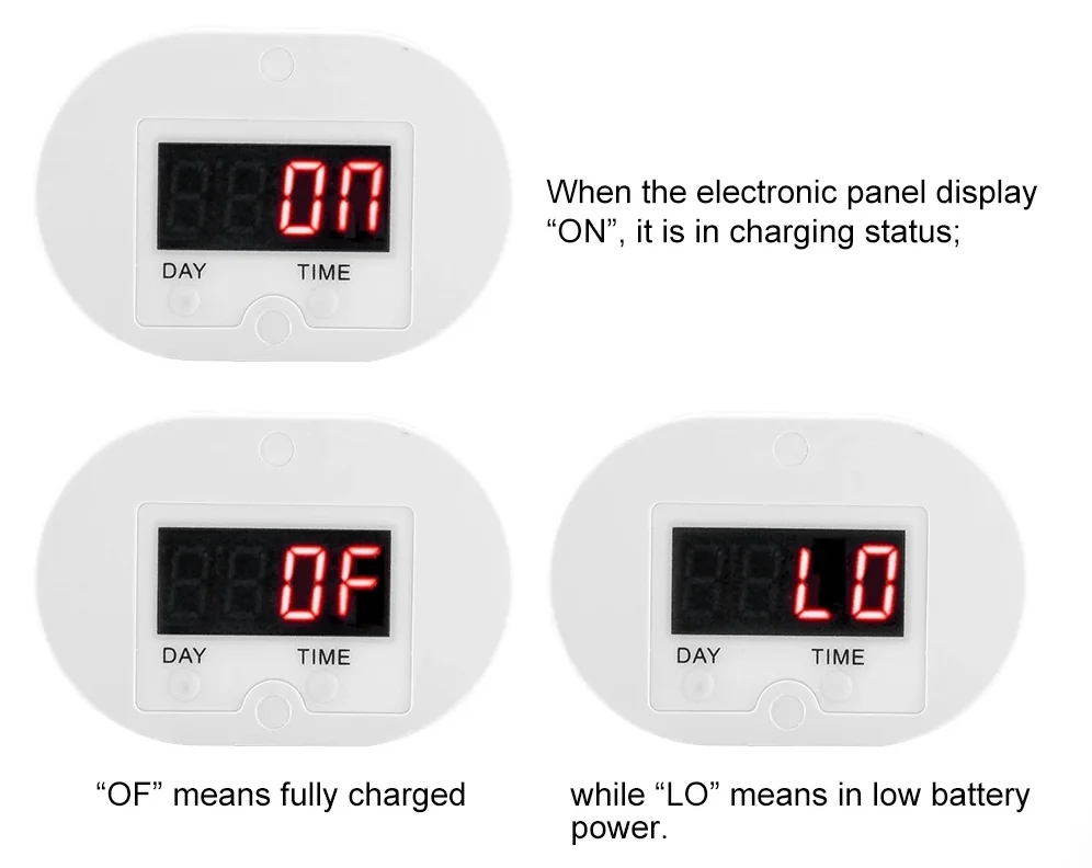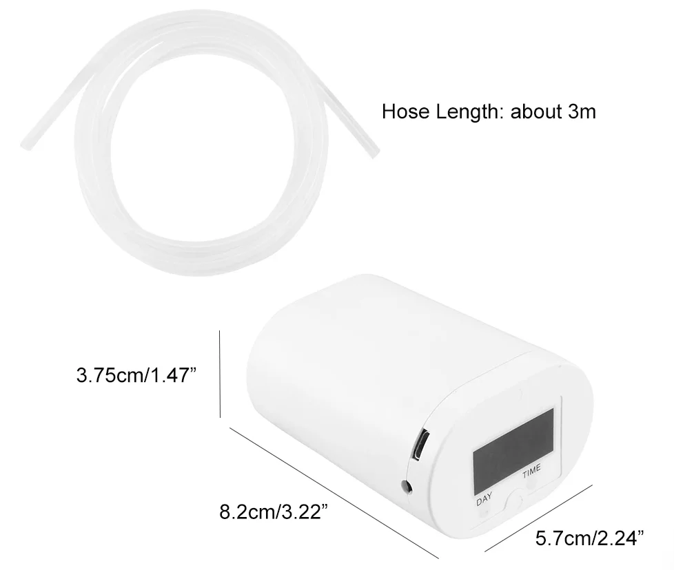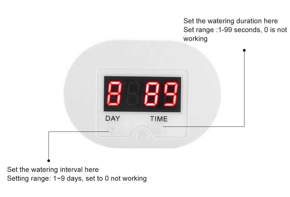 A szivattyú egyben az időzítő is, ami akkumulátoros, egy 2000 mAh-s telep van benne, amit micro USB porton keresztül táplálhatunk. A kütyün beállíthatjuk, hogy 1 és 9 nap között milyen rendszerességgel működjön, és minden bekapcsoláskor 1 és 99 másodpercen keresztül folyassa a vizet. Ez a mennyiség bőven elég, hogy a növények jól érezzék magukat. Például be lehet állítani, hogy kétnaponta egy percen keresztül öntözzön.