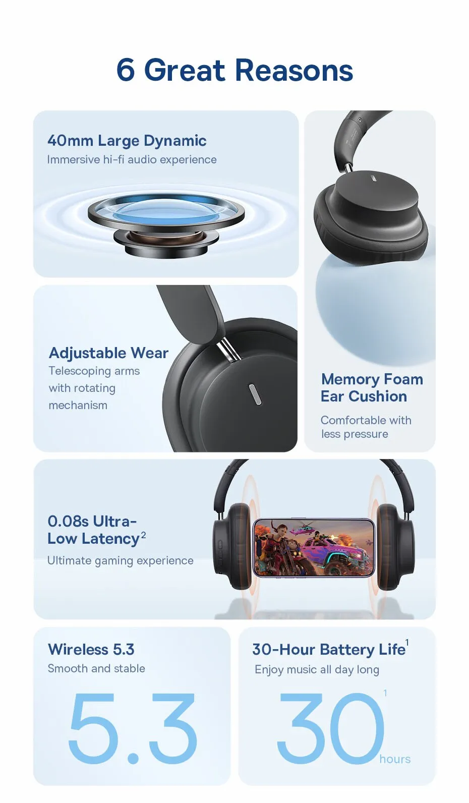 A Baseus Bowie D03 40 mm-es drivereket kapott, amiket a memória habos fülpárna fog körül. A fejhallgató természetesen over-ear kialakítású és a formája miatt a legtöbb embernek a füle kényelmesen el fog férni a párnák ölelésében. A fejhallgató szárai állíthatók, ráadásul az árát tekintve meglepő, de fém pántokat használtak, így biztos nem fog olyan könnyen eltörni, mint a műanyag darabok. A könnyebb hordozhatóság érdekében a kagylók befordíthatók 95 fokban.