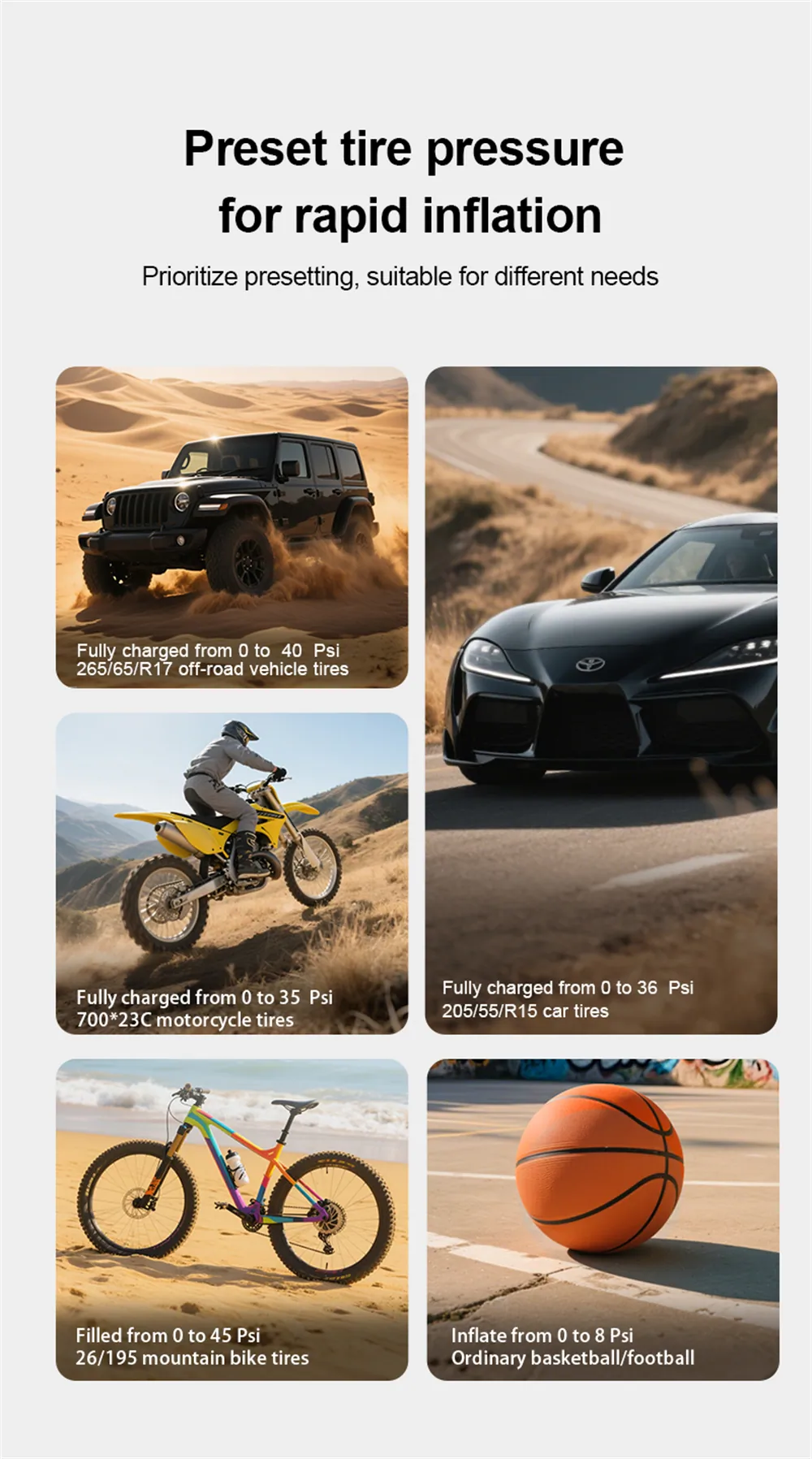 A csomagban pedig minden benne van, amire szükséged lehet: maga az eszköz, egy menetes légcső, 4 különféle fúvóka (labdához, biciklihez, matrachoz stb.), egy EVA táska, 1 méteres Type-C töltőkábel, intelligens bikázócsipesz, és természetesen egy útmutató is.