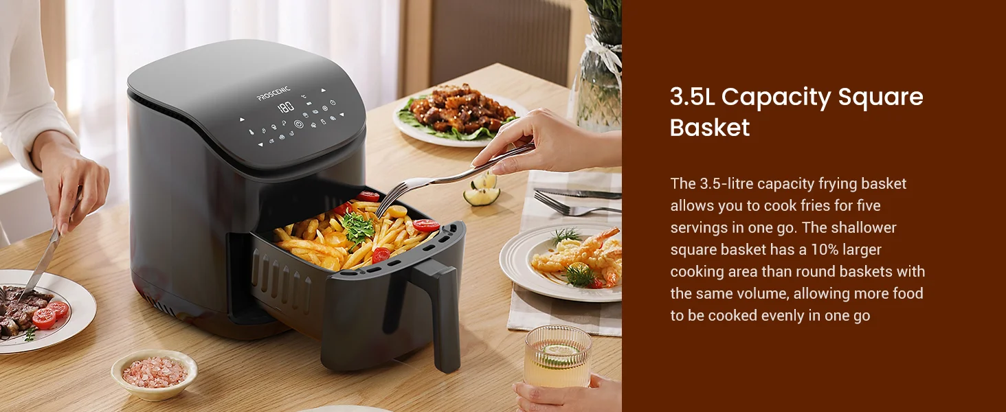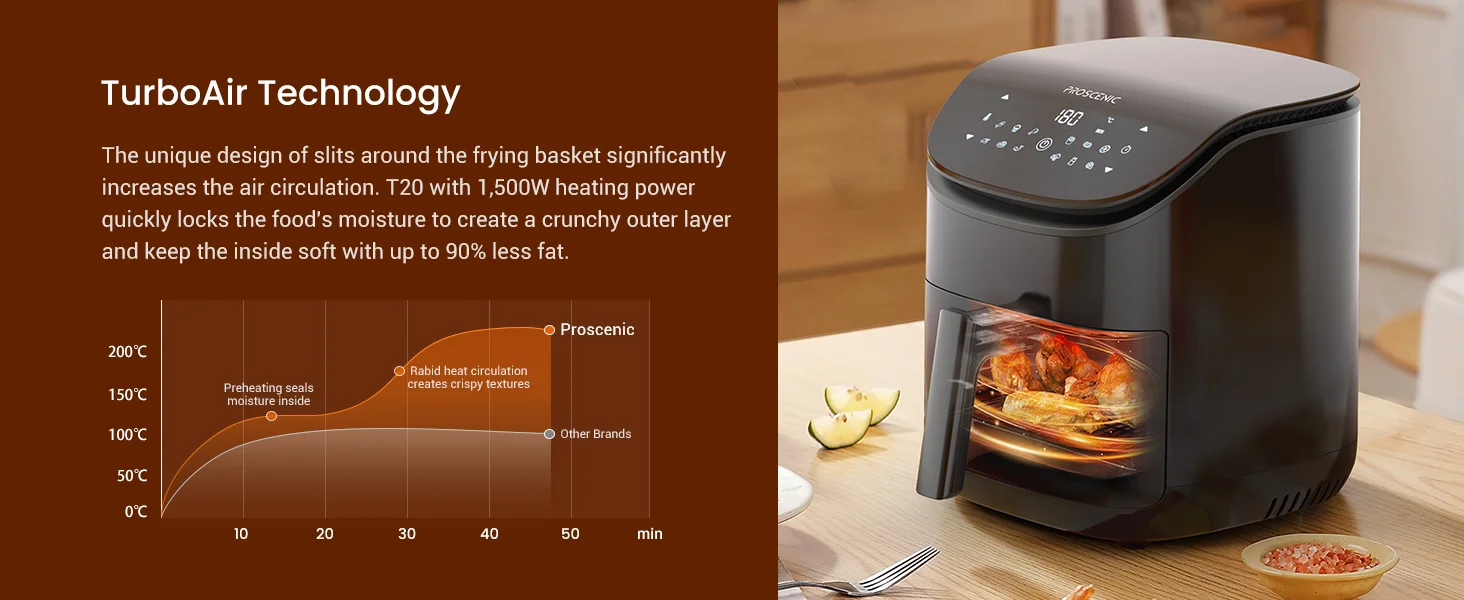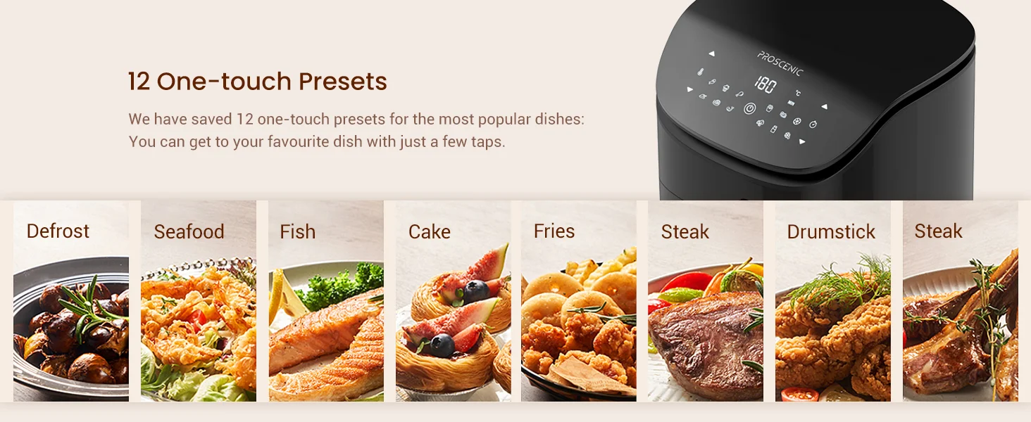 A Proscenic T21 és a T22 készülékekkel óriásit robbantott a Proscenic, így nem csodálkoztunk, amikor megjelenttették a T20-at. A család legfiatalabb és egyben legkisebb tagja 3,5 literes kosarat kapott, vagyis elsősorban lakótársaknak és pároknak lesz ideális választás. Nem foglal sok helyet, így például a nyaralótokba is simán levihetitek. A tetején találjátok az érintőgombokat, melyekkel beállíthatjátok a sütési időt és hőmérsékletet, illetve itt választhattok a 12 program közül. Még egy LCD kijelzővel is ellátták, ami minden fontos információt mutat a sütés állapotáról.
