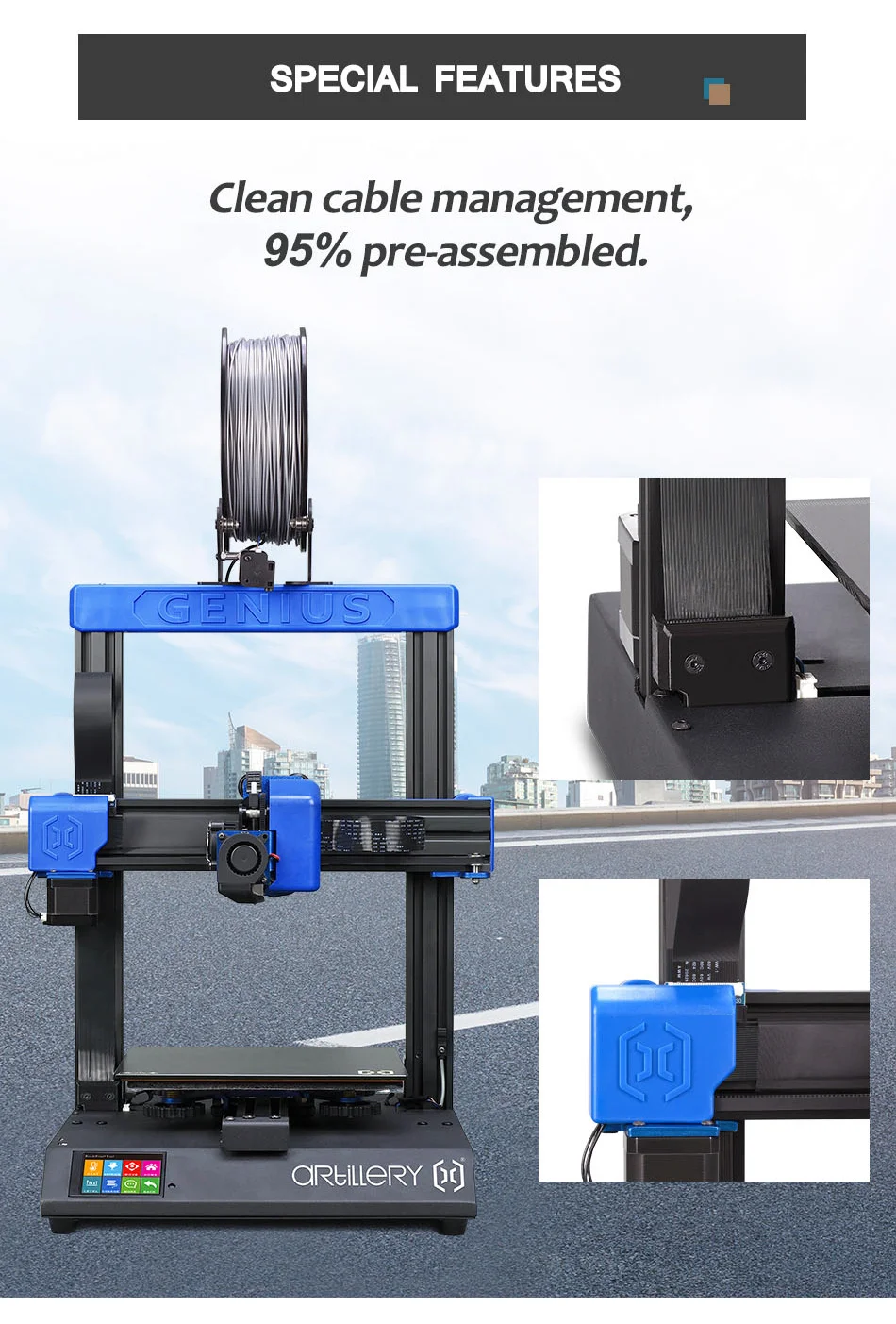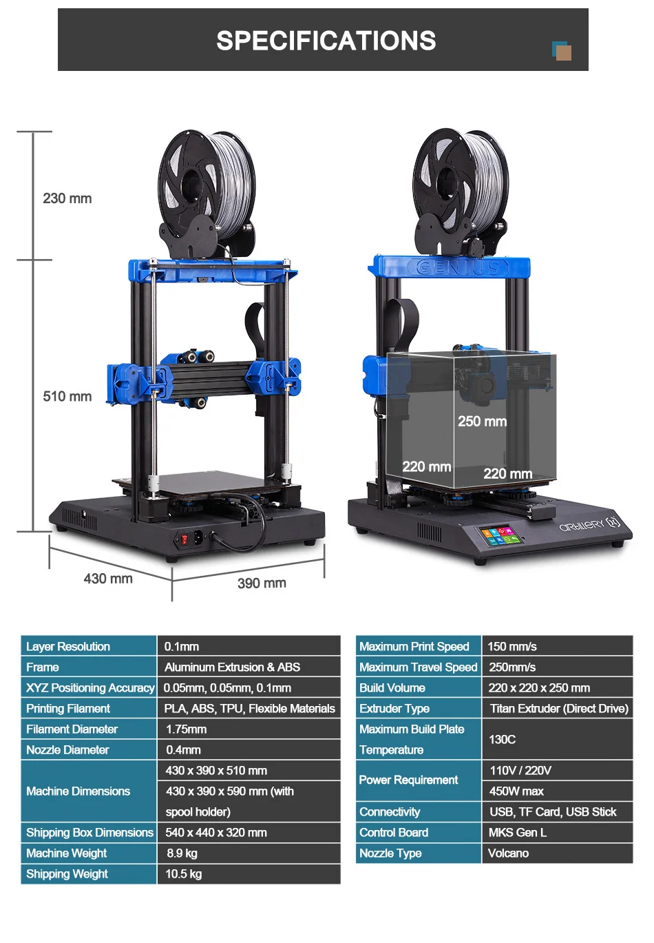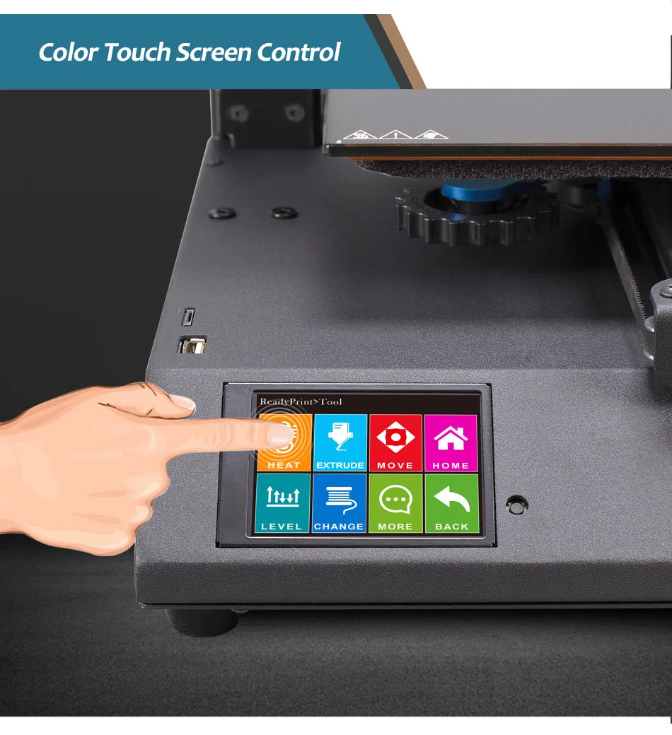 A nyomtató PLA, ABS, TPU és egyéb flexibilis filamentekkel képes dolgozni, 0,1 mm-es rétegfelbontás mellett. Memóriakártyáról és pendrive-ról is képes beolvasni az adatokat, és még egy érintőkijelzőt is kapott, amelyen beállíthatjuk az alapvető funkciókat. A gép összeszereléséhez minden szerszámot és kiegészítőt mellékelnek.