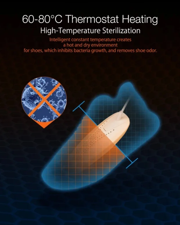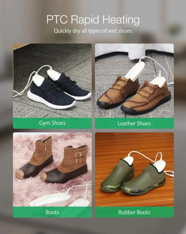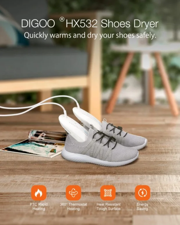 A Digoo DG-HX532 egy elektromos cipőszárító, melynek segítségével rövid idő alatt megszáríthatjátok és fertőtleníthetitek a cipőiteket. A fűtőtestek 21×7 centiméteresek, a tápkábel pedig 113 centiméter hosszú. Úgy alakították ki őket, hogy 360 fokban adja le a hőt, így nem maradnak nedves foltok a cipőn. Bekapcsolás után pillanatok alatt felmelegszik, 60-80 Celsius-fok között üzemel, melynek köszönhetően gyorsan megszárad a lábbelitek, sőt, még a kellemetlen szagokat árasztó baktériumokat is elpusztítja. A kütyüt mindenféle lábbeliben használhatjátok, legyen az edzőcipő, futócipő, bőrcipő, csizma vagy bakancs.
