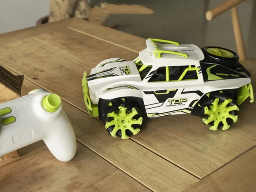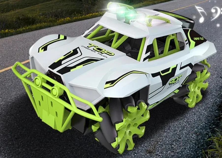 Négykerék meghajtású az autó, viszont a speciális görgős kerekeinek köszönhetően egyhelyben meg tud fordulni, illetve oldalazó mozgásra is képes. Ez biztos, hogy nem működik vele nagyon szépen, de ennyi pénzért ne is várjunk tökéletes kütyüt. Kétféle sebességi fokozata van, a gyorsabb módban pedig elérheti a 20 km/órát. Egy töltéssel nagyjából fél órát tud menni, újratölteni pedig egy USB-s kábellel lehet. 2,4 GHz-en kommunikál a rádiós távirányítója az autóval, amelybe két darab AA méretű elemet kell tenni, amit nem adnak hozzá alapból.