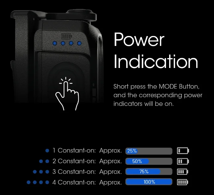 Könnyű szerkezet, csak 56 grammos, pedig van benne egy beépített 650 mAh kapacitású akkumulátor is. Ha röviden megnyomjuk a módválasztó gombot, akkor megmutatja egy négyes skálán, hogy még mennyi szufla van a telepben. Amennyiben tölteni szeretnénk, azt egy sima Type-C porton keresztül megtehetjük.
