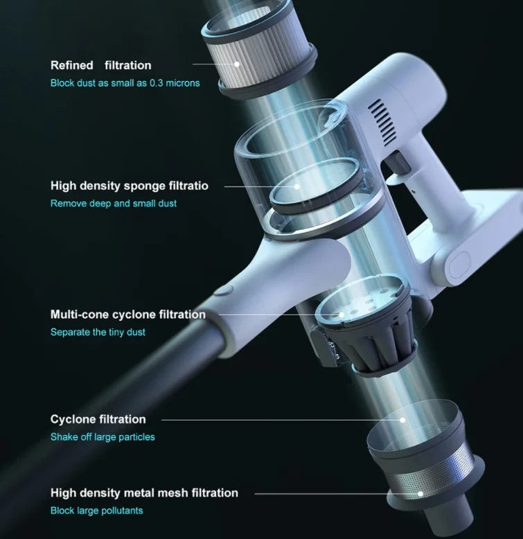 Hatlépcsős szűrőrendszerében 12 ciklonos leválasztó és HEPA filter is van, a levegőből kiszedi így a por majdnem 100%-át. A kiegészítők terén nem lehet panaszunk a gépre, alapból adnak hozzá egy motoros padlótisztító fejet, ami V-mintázatú szilikonos kefével rendelkezik, mely nagyon hatékonyan takarít szinte bármilyen felületet, akár a szőnyegeket is. A kárpittisztító motoros fej sem marad ki a csomagból, amivel a matracokat és ülőgarnitúrákat tudjuk tisztán tartani. A különböző szűkítőfejek minden porszívónál alapok, viszont ehhez flexibilis csövet is mellékelnek, amire csak akkor fogunk rádöbbenni, hogy milyen hasznos, amikor már használjuk. Kifejezetten autó takarításhoz ajánlott, így minden hülye helyről ki tudjuk szippantani a mocskot, és nem kell ezért tisztítóba vagy benzinkútra menni vele.