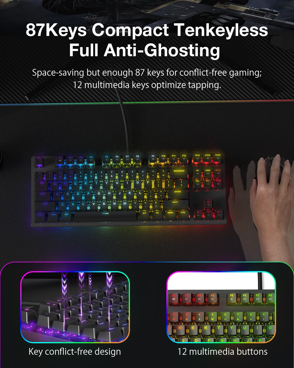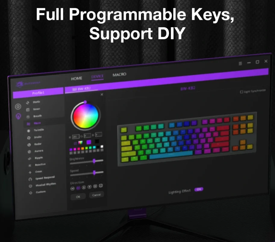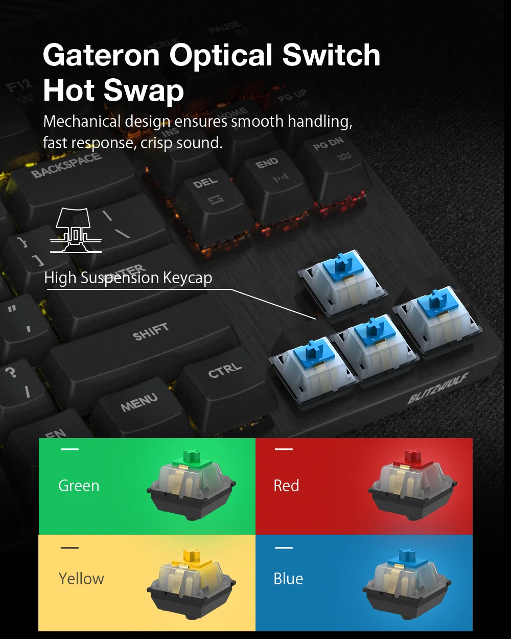 A BlitzWolf billentyűzetén az összes gombot fel lehet programozni, így az igazi hardcore júzerek is jól használhatják. USB Type-C porton keresztül kapcsolódik a géphez, és tartozik hozzá egy külön szoftver, amiben testre lehet szabni a LED világítást, az egyes billentyűk funkcióit és makrózásra is van lehetőségünk benne. NKRO technológiát is kapott, ami annyit takar, hogy nincsen ghosting, az eszköz akár az összes gomb egyidejű lenyomását is tudja érzékelni.