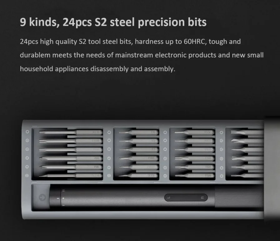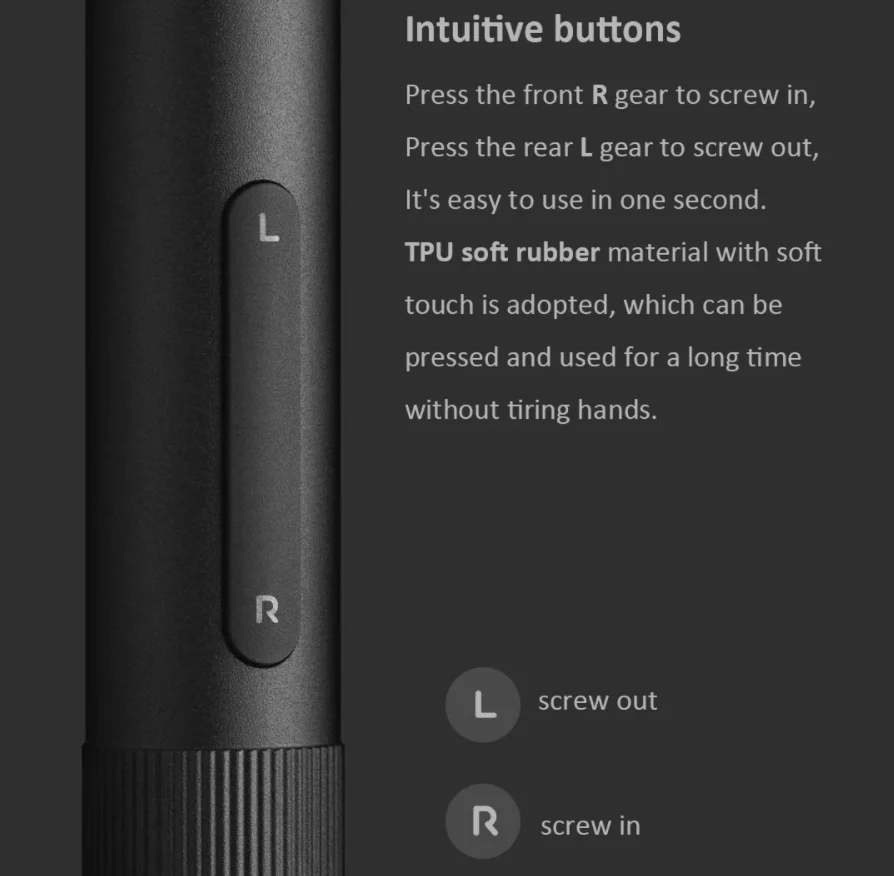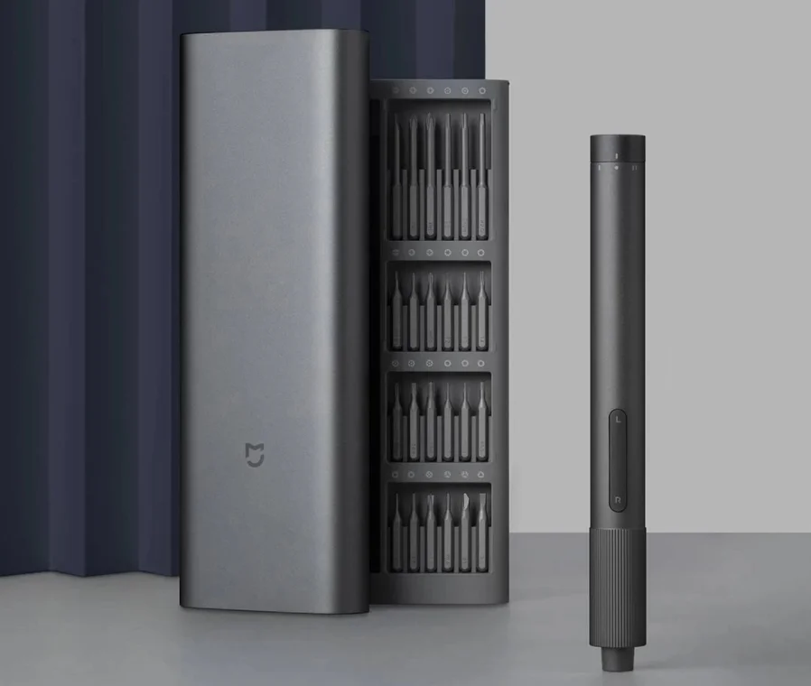 Első ránézésre a Xiaomi kézi csavarozókészletére hasonlít ez az elektromos darab, de az alumínium doboz egészen mást rejt. A csavarozó kétlépcsős nyomatékállítóval rendelkezik, a legnagyobb beállítható érték 0,2 Nm, de ráhúzhatunk még kézzel is a csavarokra, ha ezzel nem elégednénk meg, ugyanis ha a kapcsolót középállásba tesszük, akkor rögzíti a fejet, és egyszerű csavarhúzóként is használhatjuk. Az akkumulátora 350 mAh kapacitású és 3,7 V-os, tölteni pedig Type-C porton keresztül tudjuk. A fokozatokat a végén egy tekerővel állíthatjuk, az irányt pedig egy dupla gombbal oldották meg, ha az R feliratot nyomjuk, akkor becsavarozunk, ha pedig az L-t, akkor kifele.