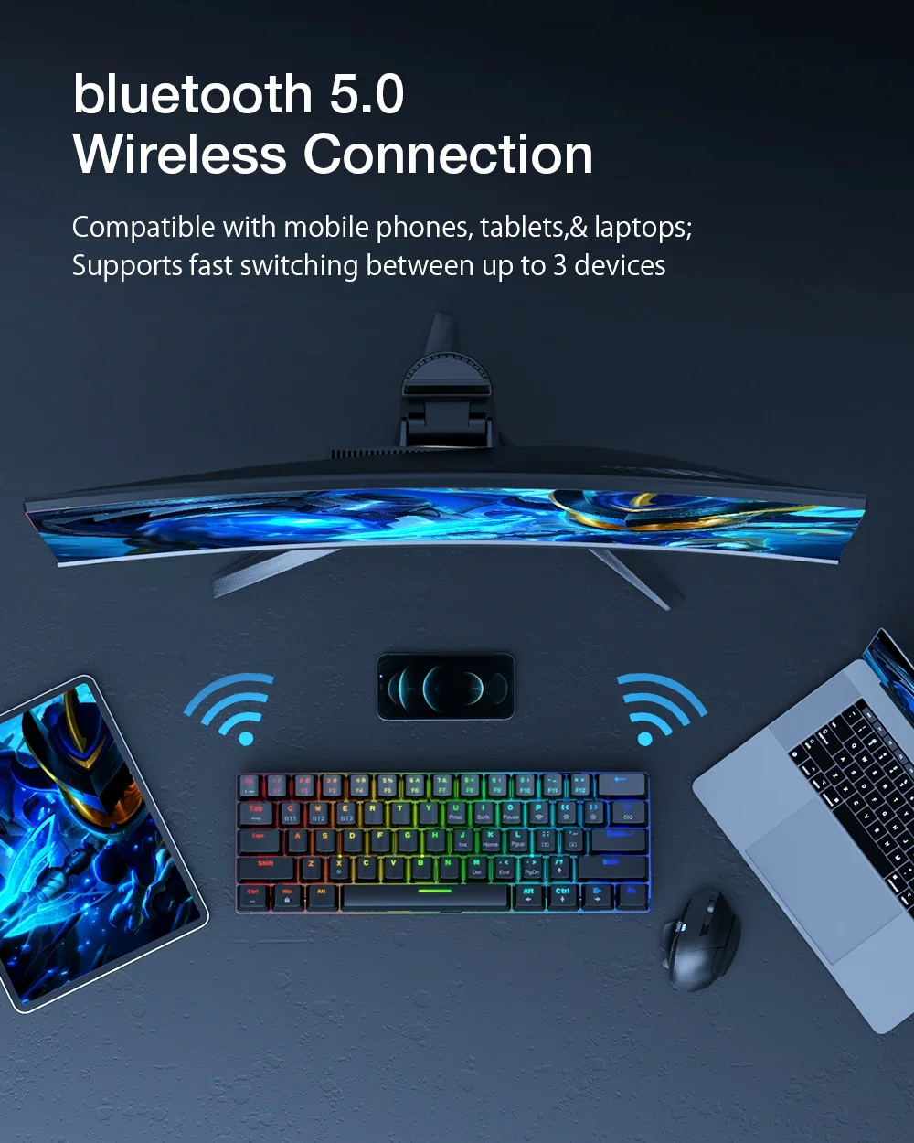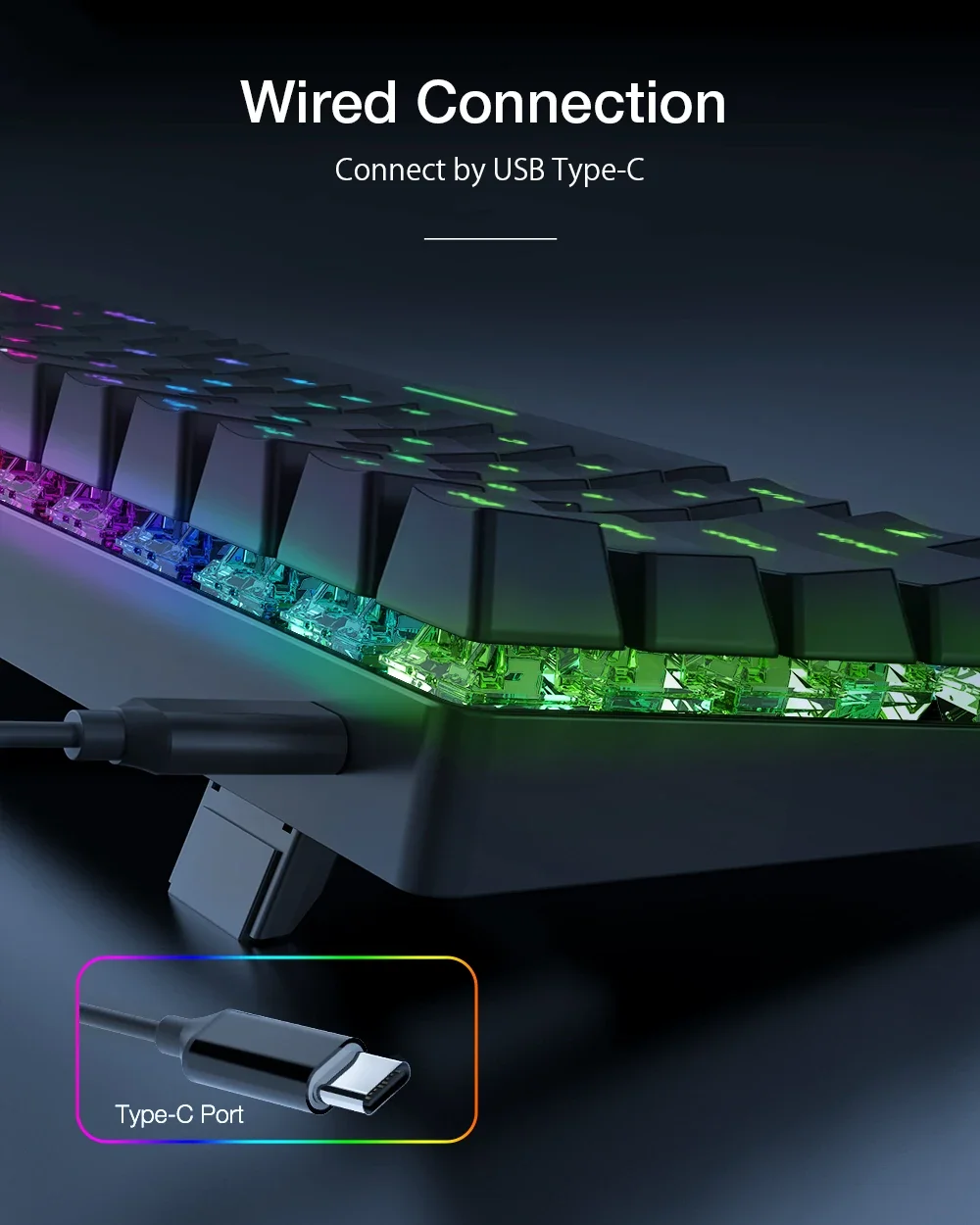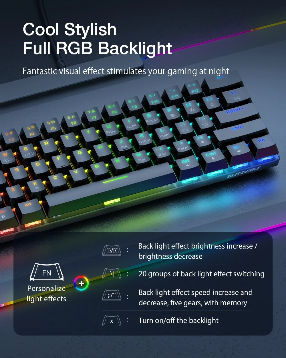 A BlitzWolf BW-KB0 mérete 290x95x35 mm szóval eléggé kompakt, könnyen hordozható, ez jól tud jönni, ha mondjuk tablethez, vagy mobilhoz csatlakoztatva használnátok, amit a Bluetooth-os vagy Type-C-s kapcsolat lehetővé tesz. Beépített akkumulátorral rendelkezik, amelynek a kapacitása 1900 mAh, ez nagyjából 15 óra folyamatos használatra elég. Ebben benne vannak az RGB LED fényhatások is már, amik ezerféleképpen testre is szabhatóak. Enélkül már nincs is gamer cucc, de tényleg tud adni egyfajta pluszt, még ha ez teljes mértékben ki is merül a látványban.