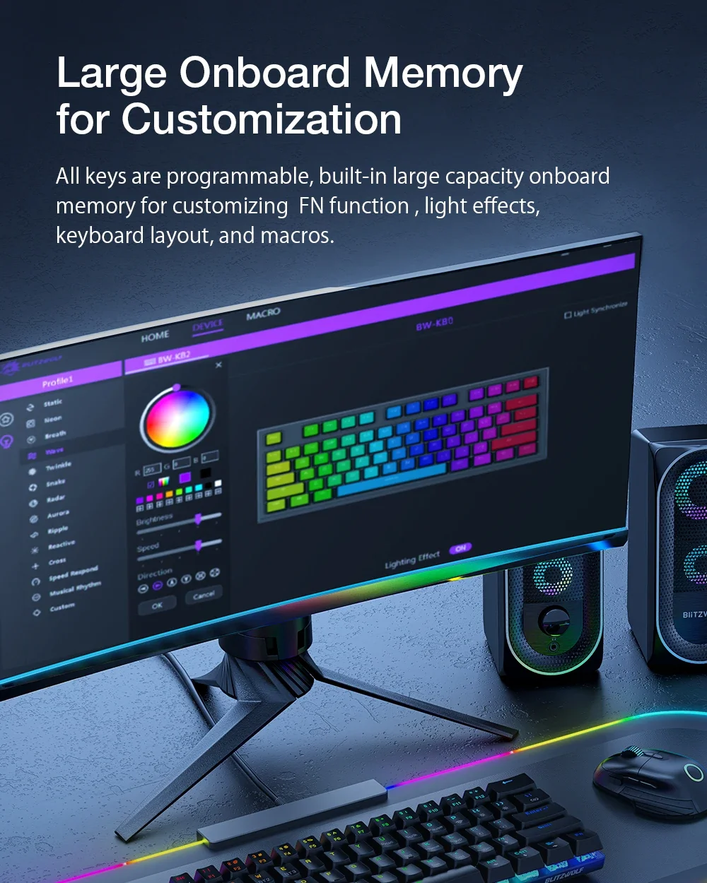 A kompakt kialakítás érdekében egy egész sornyi billentyűt – történetesen a funkció billentyűkről van szó – lehagytak a BW-KB0-ról, de az egész kiosztás teljesen testreszabható egy erre szolgáló alkalmazás segítségével, itt tudjátok a fényeket is a saját ízlésetekhez alakítani. A mechanikus kapcsolókat is ki lehet cserélni, ugyanis hot-swap megoldással, forrasztás nélkül szerelték őket az alaplapra. Egyaránt használható MAC és Windows alatt is, 2 színben is elérhető, feketében és fehérben.