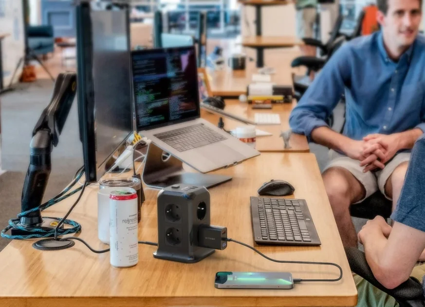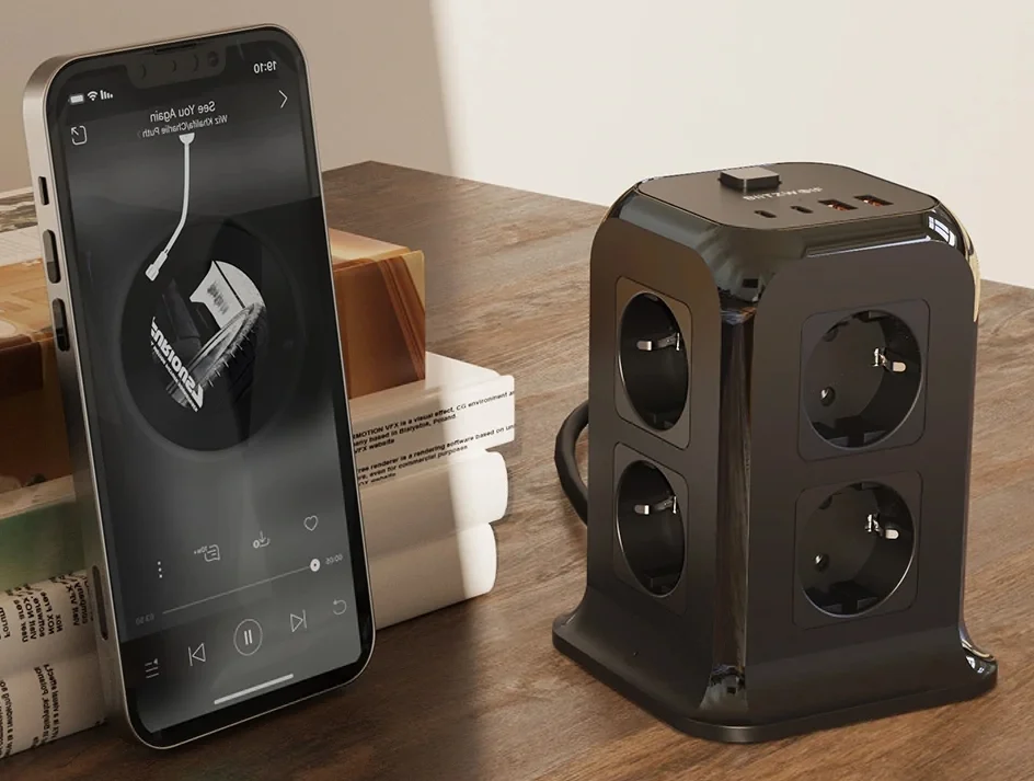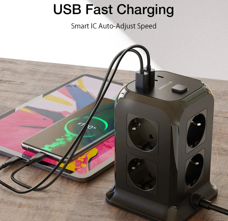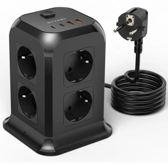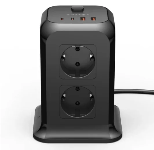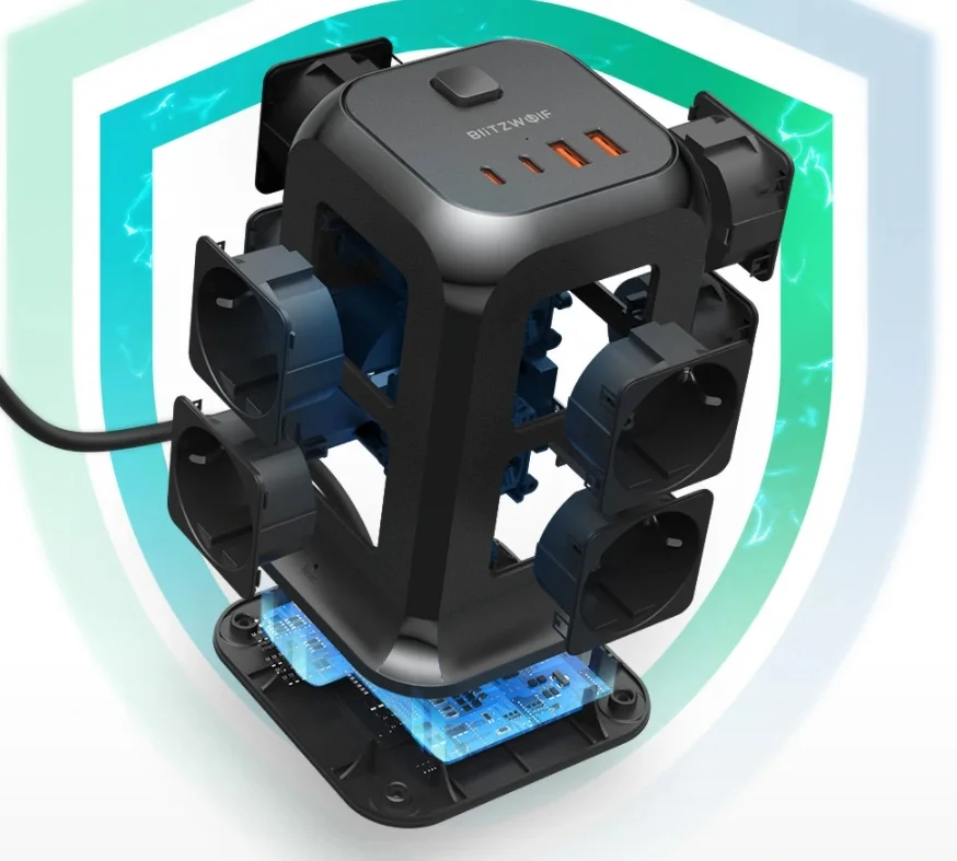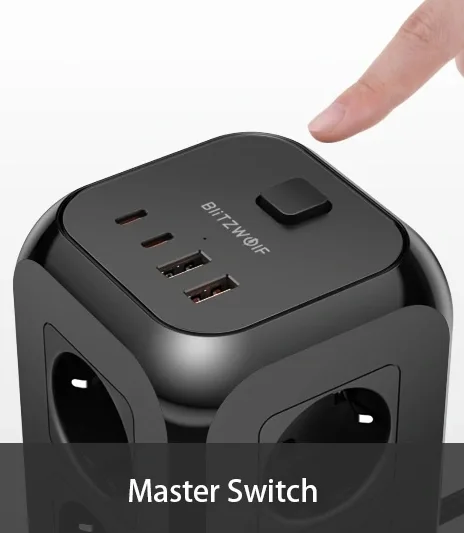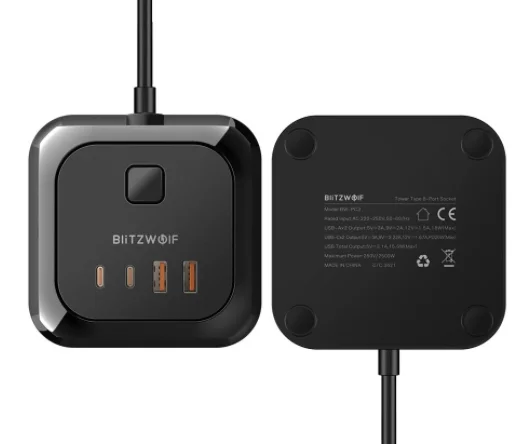 A BlitzWolf a BW-PC1 és BW-PC2 után kiadta a BW-PC3-at, ami ez eddigi legjobb kütyü, mert rengeteg csatlakozóval szerelték fel. Az eszköz EU dugós, és 2 méternyi kábellel rendelkezik. A kialakítása olyan, hogy nyugodtan felhelyezhetjük egy asztalra is, az aljára csúszásgátló gumit tettek. A tetejére került a két Type-C és a két hagyományos USB csatlakozó, valamint a bekapcsológomb. Ez utóbbival az egész elosztót áramtalaníthatjuk. Nyolc darab hagyományos 230 V-os csatlakozó van rajta, ami úgy jön ki, hogy a négy oldalán 2-2 dugalj látható.