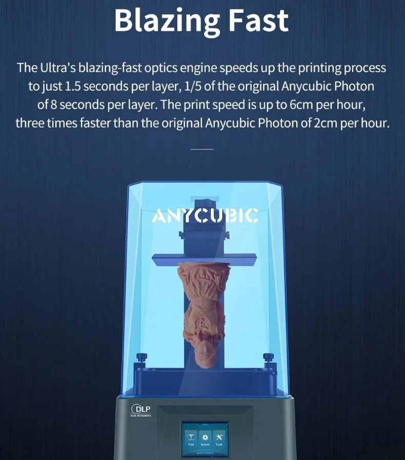 A DLP eljárás lényege, hogy a létrehozott modell részletgazdag és nagyon jó minőségű. Gyakorlatilag az eredmény sokkal szebb, mint egy filamentből készített darab esetén. Digitális projektorral UV fényt vetít, ami megköti a fotopolimert, mely a tégelyben van folyékony állapotban. Ezt minden egyes réteggel megcsinálja, amiknek a vastagsága 80 mikron, azaz 0,08 milliméter. A gép így húzza egyre feljebb a tálcát, és keményíti a műgyantát. Hasonlóan működik, mint az LCD gépek, viszont az élettartamuk nagyjából tízszeres. A Photon Ultra legfeljebb 102x57x165 milliméteres munkadarabot tud nyomtatni, a sebessége pedig maximum 60 milliméter/óra. Halkan működik, ami hosszú feladatoknál nagyon nagy előny, valamint az áramfelvétele is csak 12 watt.
