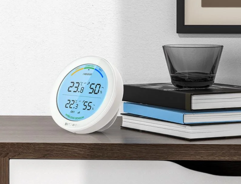 Az BlitzWolf BW-WS01 egysége köralakú, és 9 centiméter átmérőjű. Folyamatosan mutatja a benti hőmérsékletet és páratartalmat, valamint egy külső szenzor beküldött értékeit is. Ha fent megérintjük a kütyüt, akkor felvillan a fehér háttérvilágítás és 15 másodpercen keresztül égve is marad. CR2477-es gombelemmel működik, amivel elméletileg három hónapot bír, de ha kezd lemerülni, akkor jelez az eszköz. A hátoldalán egy kinyitható láb bújik meg, ezzel kitámaszthatjuk, de mivel erős mágnes is van benne, így nagy fémfelületekre (pl. hűtőajtó) is rá lehet cuppantani.