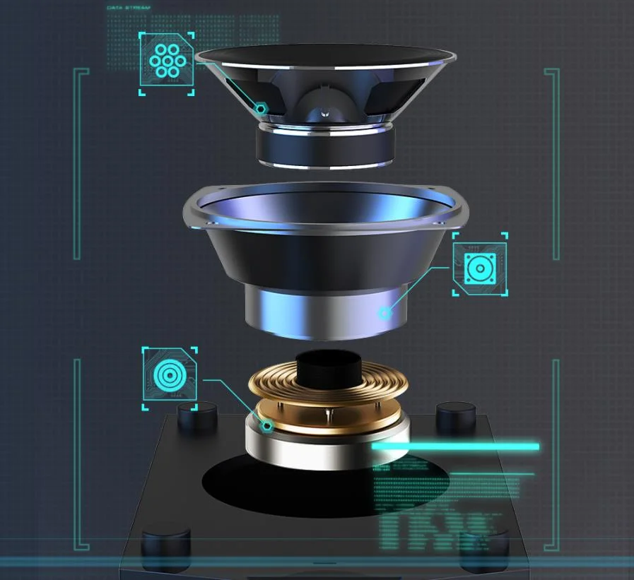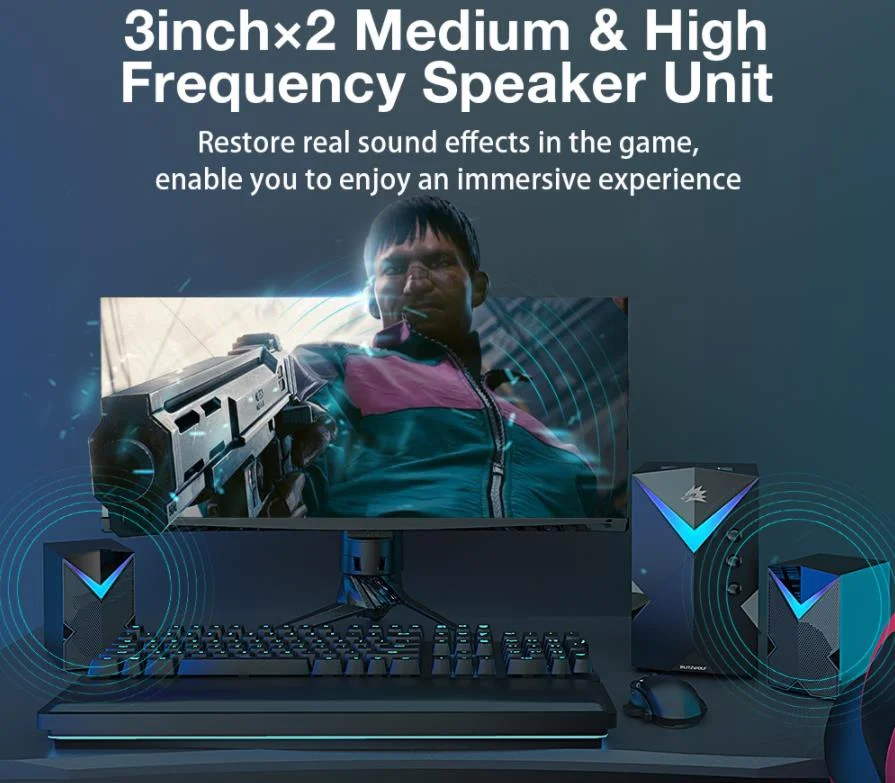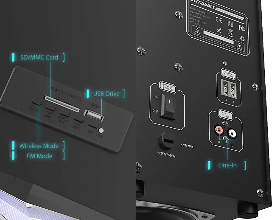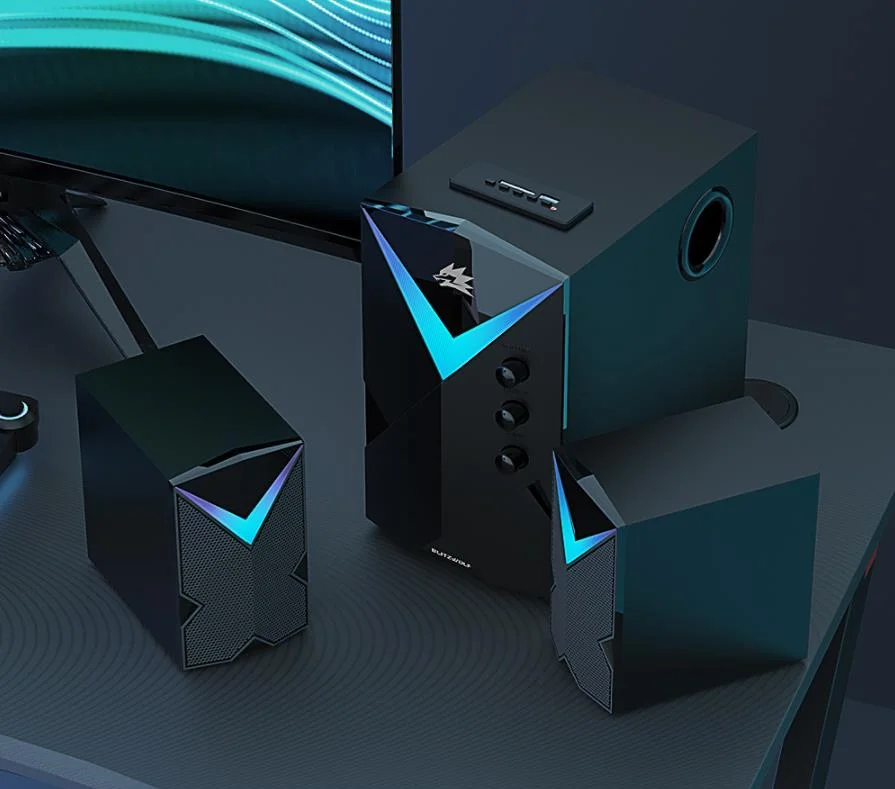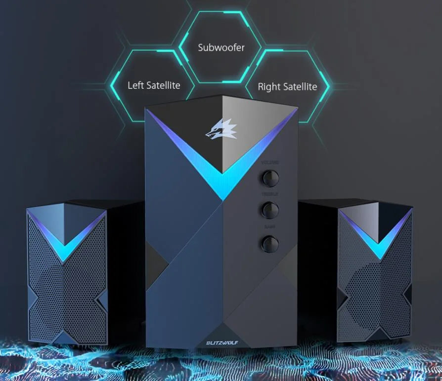A BlitzWolf BW-GT2 egy 2.1-es gamer, aktív hangrendszer, ami két szatellit hangszóróból és egy mélynyomóból áll. A leglátványosabb díszítő eleme a V-alakú LED világítás, ami kék fénnyel turbózza fel a megjelenését a három hangszórónak. A BW-GT2 mélyládája 145x210x260 milliméter, míg a kis sugárzók 105x85x150 mm-es méretekkel rendelkeznek, a rendszer pedig összesen 20 wattos teljesítménnyel bír. A tetején találjátok a vezérlőgombokat, az EQ gombot, illetve az USB és az SD bemenet, így akár ezeken a csatlakozókon keresztül is képes zenéket lejátszani. FM rádió is került bele, vagyis, ha még szoktatok rádiót hallgatni, akkor erre is van lehetőségetek. A gyártó a Bluetooth-t sem spórolta ki belőle, vagyis simán rácsatlakozhattok a mobilotokkal, PC-tekkel a készülékre, így onnan is nyomathatjátok a kedvenc számaitokat, podcastjeiteket. Az előlapjára három potméter került, melyekkel a hangerőt, a basszust és a magas hangokat tudjátok szabályozni.