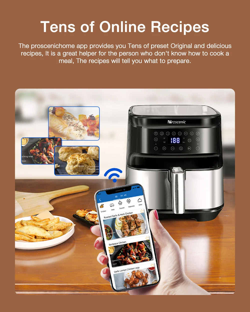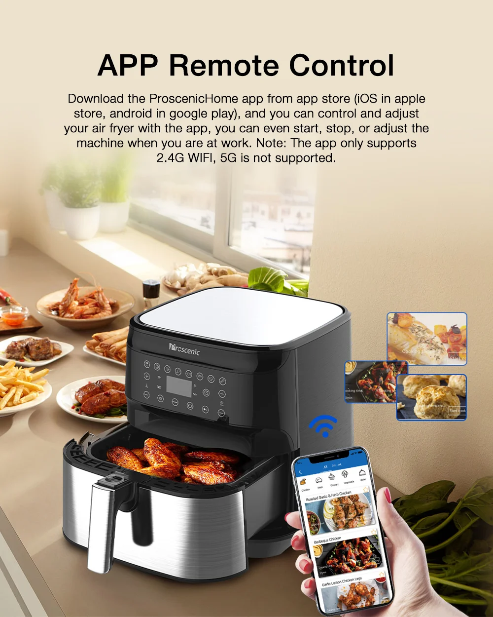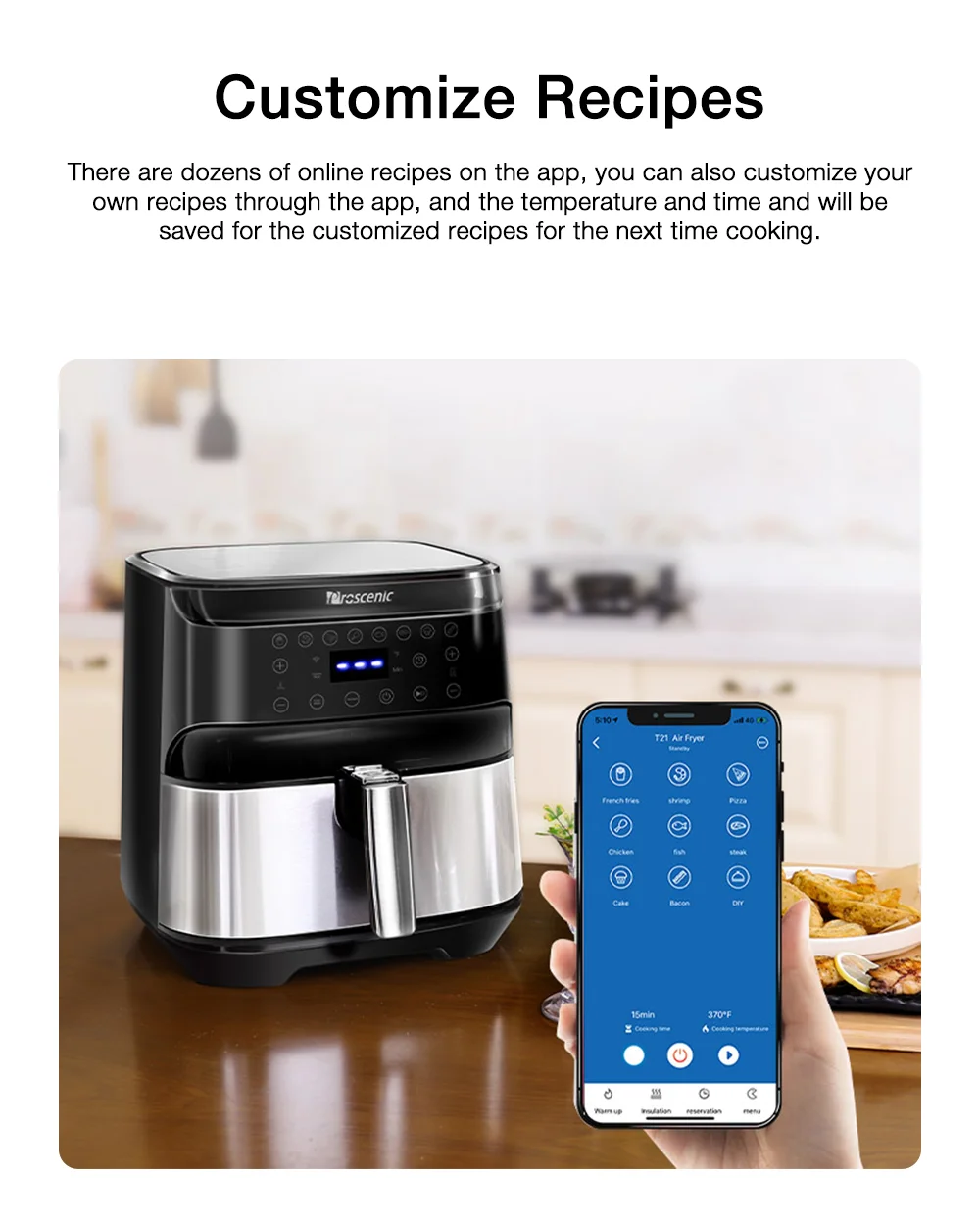 A Proscenic T21 remekül sikerült, több versenytársa megirigyelné a tudását. Az 5,9 kilogrammos gép 31,4×31,6×32,6 centiméteres méretekkel rendelkezik, vagyis ideális választás lesz kisebb konyhákban, kollégiumokban, vagy akár hétvégi házakban is. A kosara bőven átlagon felüli, 5,5 literes, vagyis rengeteg finomság elfér benne. A T21 1700 wattos teljesítménnyel dolgozik, a kosárban pedig folyamatosan keringeti a forró levegőt, így minden egyenletesen fog átsülni, legyen szó akár csirkemellről vagy sültkrumpliról. A behelyezett ételeket akár extra olaj vagy zsiradék nélkül is megsüthetitek, így nemcsak egészségesebb lesz a menü, de még a pénztárcátokat is kímélhetitek.