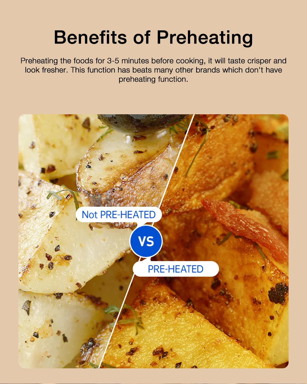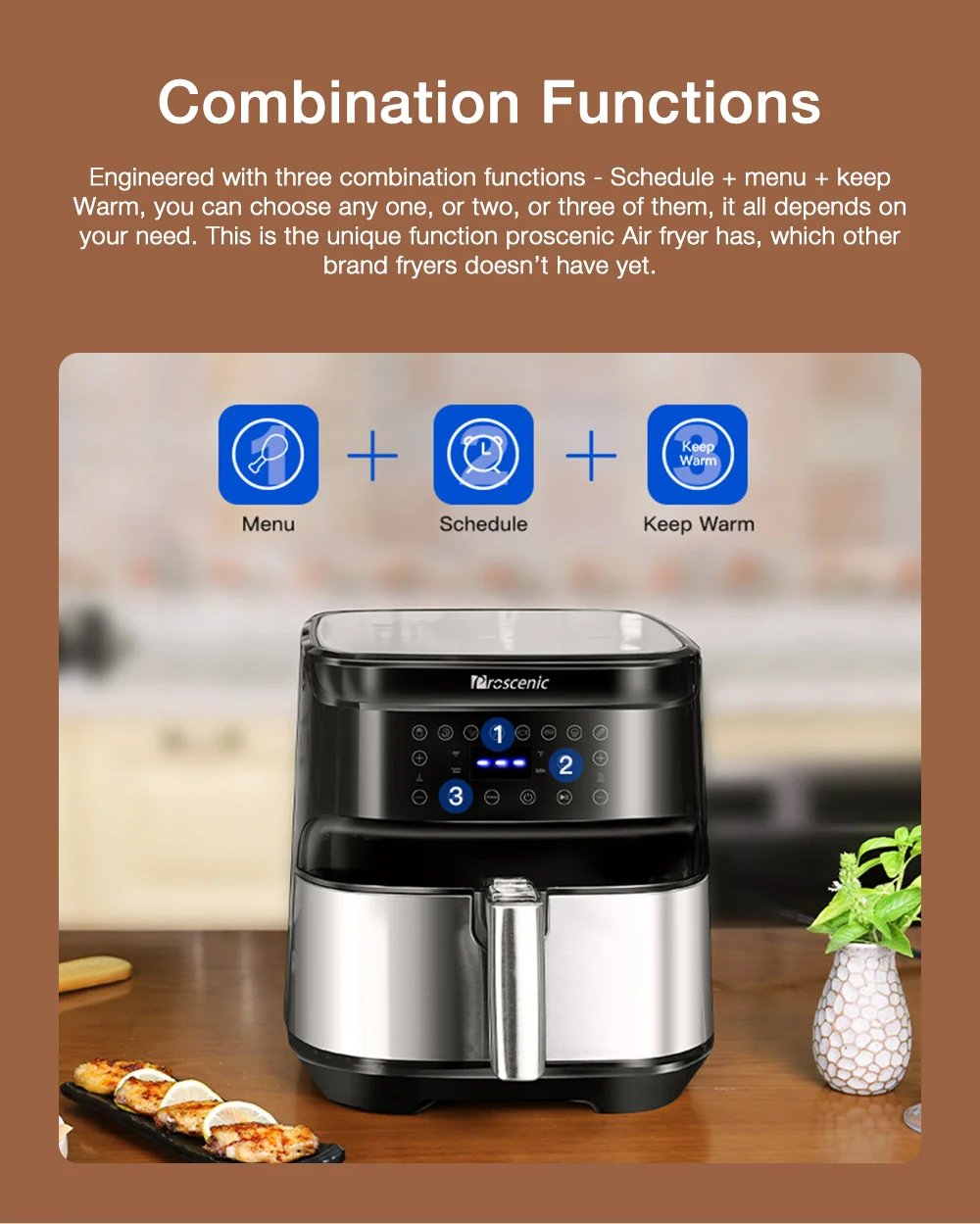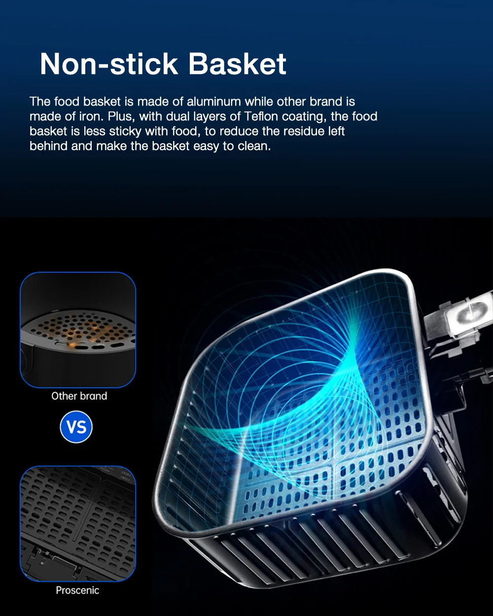 A Proscenic T21 remekül sikerült, több versenytársa megirigyelné a tudását. Az 5,9 kilogrammos gép 31,4×31,6×32,6 centiméteres méretekkel rendelkezik, vagyis ideális választás lesz kisebb konyhákban, kollégiumokban, vagy akár hétvégi házakban is. A kosara bőven átlagon felüli, 5,5 literes, vagyis rengeteg finomság elfér benne. A T21 1700 wattos teljesítménnyel dolgozik, a kosárban pedig folyamatosan keringeti a forró levegőt, így minden egyenletesen fog átsülni, legyen szó akár csirkemellről vagy sültkrumpliról. A behelyezett ételeket akár extra olaj vagy zsiradék nélkül is megsüthetitek, így nemcsak egészségesebb lesz a menü, de még a pénztárcátokat is kímélhetitek.