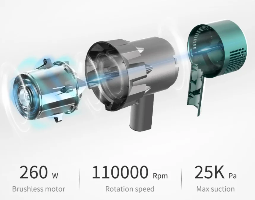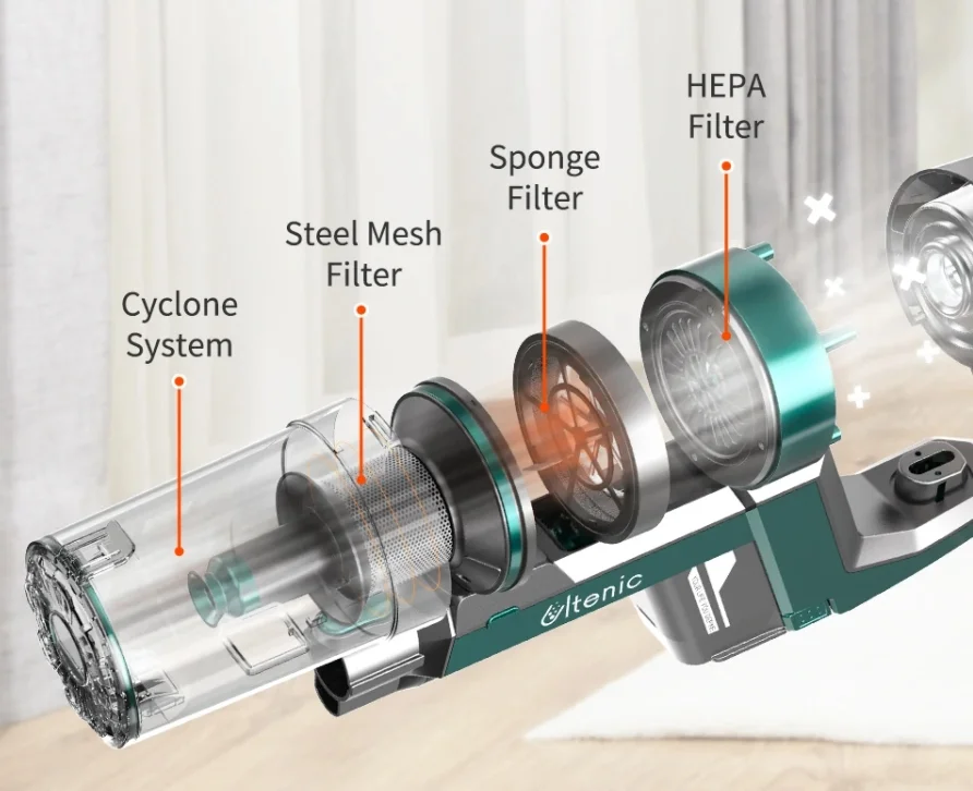 Több különböző takarítófejet mellékelnek hozzá, a motoros padlótisztító és kárpittisztító az alap, de szűkítőfejek is jár mellé. A kiáramló levegő egy négylépcsős szűrőrendszeren halad keresztül szűri, melynek az utolsó állomása a HEPA filter, ami még a legapróbb porszemeket is megköti. Kapott egy LED-es kijelzőt is, ami mutatja az akku töltöttségét, az aktuális üzemmódot, valamint az esetleges hibaüzeneteket.