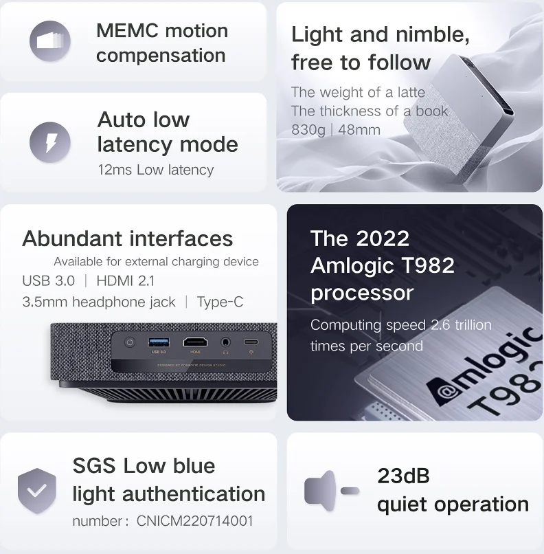 A Fengmi S5 természetesen rendelkezik képernyő tükrözéssel, Android, iOS, Mac OS és Windows rendszereket futtató hardverekkel képes együttműködni. Aki pedig nem a vezetéknélküli kapcsolatot venné igénybe, annak egy HDMI, egy Type-C vagy egy USB port áll a rendelkezésére. A projektor szoftveres részét az Amlogic T982 processzor elégíti ki, valamint 2 GB memória és 16 GB háttértár. Ez az alap mondjuk egy Google Chromecasttal párosítva tökéletes lehet.