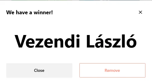 Ahogy a szabályzatban is írtuk, kisorsoltuk egy főnyertest és két pótnyertest arra az esetre, ha valamiért nem sikerülne felvennünk a kapcsolatot az elsőként kisorsolt személlyel. A sorsoláshoz az online ohmyluck felületet használtuk, szabályos keretek között, bizottsági tagok ellenőrzése alatt.