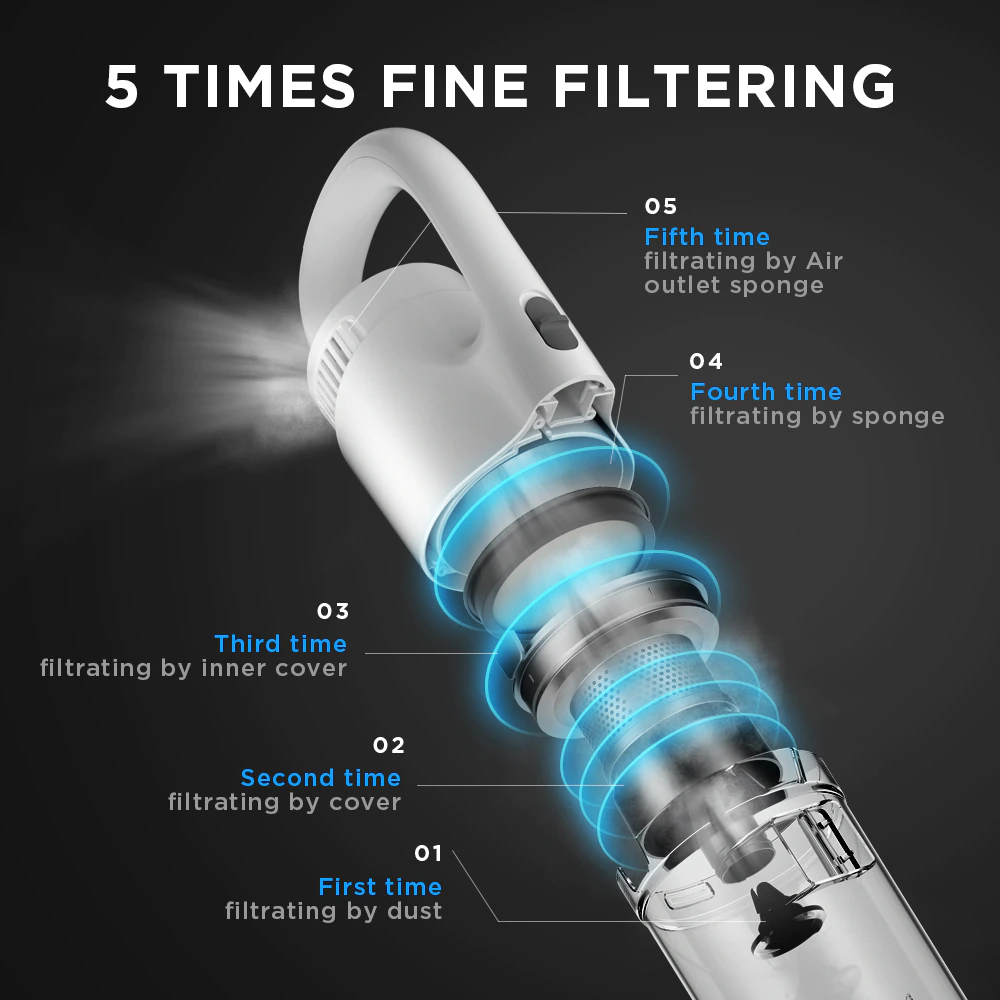 Öt fokozatú szűrőrendszere van, aminek az egyik összetevője egy HEPA filter, ami ráadásul mosható is.