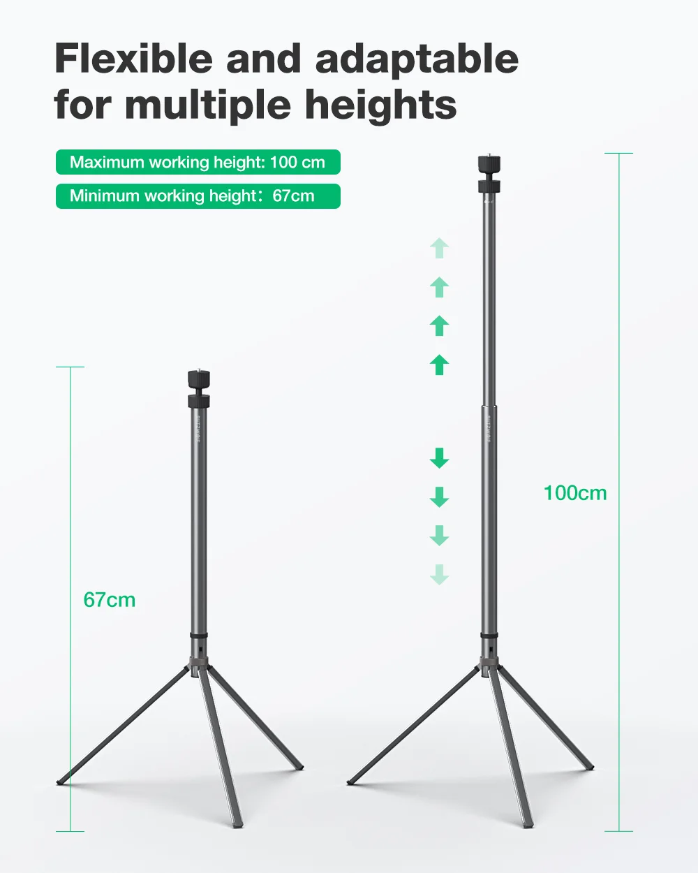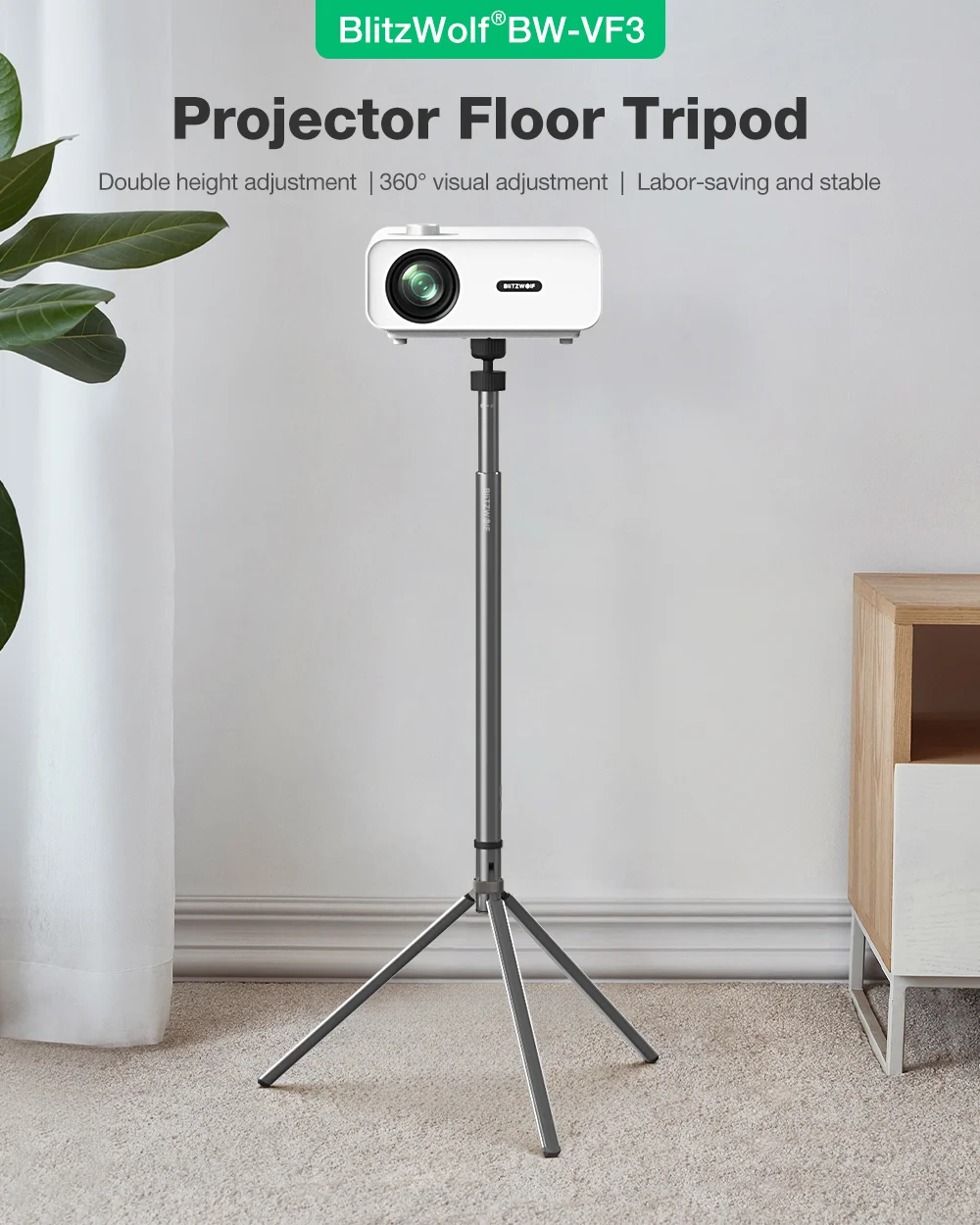 A BlitzWolf BW-VF3 állvány repülőgép alumíniumból készült és a különböző csatok és reteszek is fémből vannak rajta. Kihajtható három lábbal rendelkezik, amik rögzíthetők, tehát nem fognak összecsuklani. A magassága 67 és 100 cm között állítható, a teleszkópos rúd pedig egyszerűen, becsavarással rögzíthető, amire külön magyarázó piktogram hívja fel a figyelmet. A fején egy szabványos menetes csap található, amire nemcsak projektorokat, hanem más kompatibilis eszközöket is lehet tenni, például fényképezőgépet vagy akciókamerát. A teherbírása 3 kg, tehát elég sok eszközt elbír. Gömbcsuklós mechanizmusával mindenféle szögben állítható, tehát a projektorral akár még a plafonra is lehet vetíteni a segítségével.