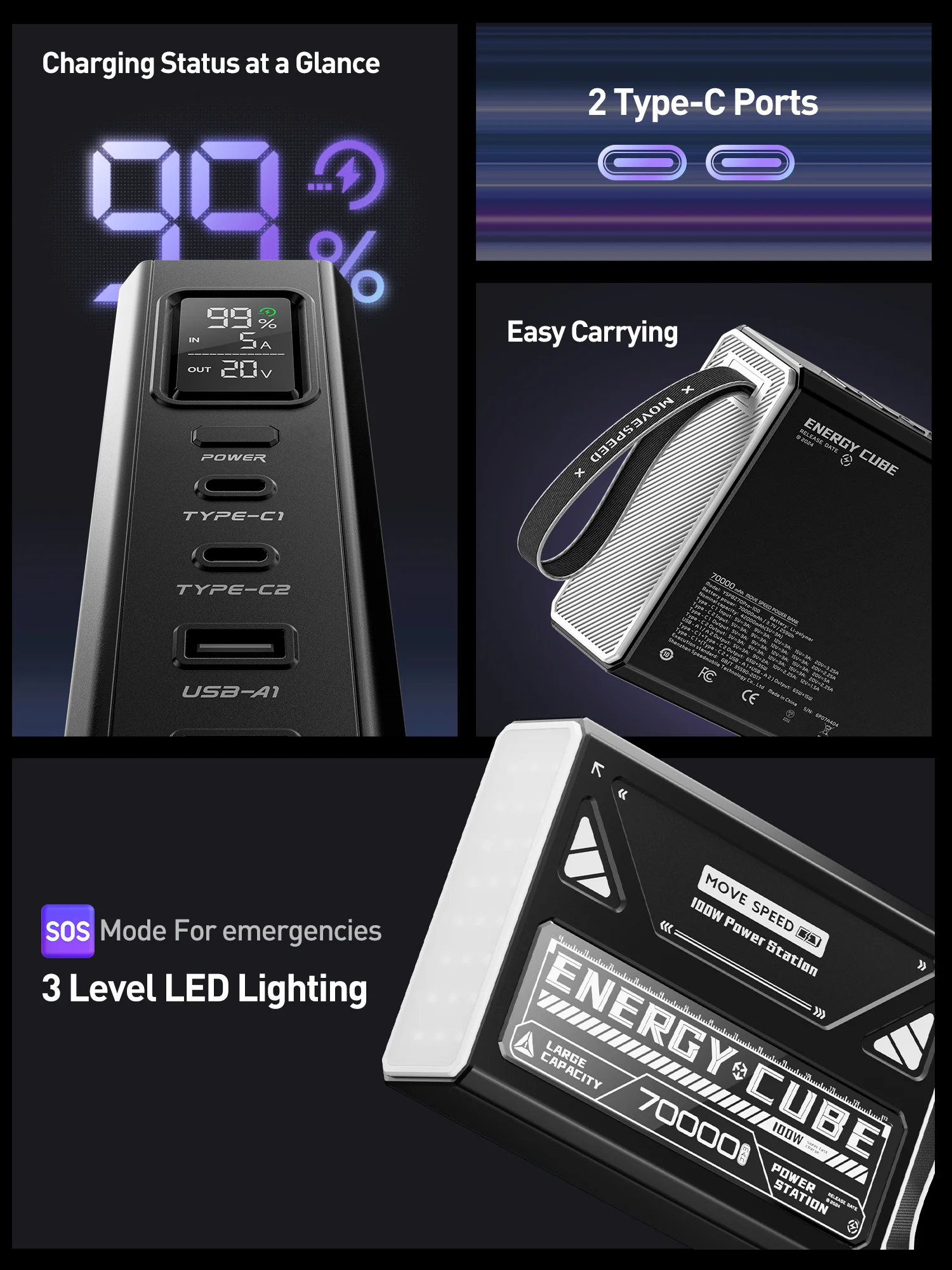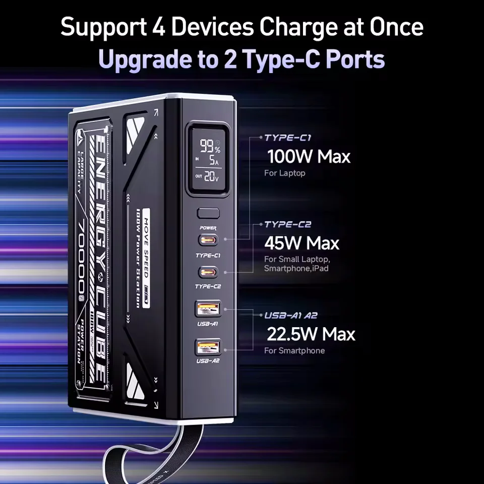 Van az úgy, hogy egy sima töltő már nem elég. Mikor a laptop, a drón, a tablet és a telefon egyszerre ordít energiáért, de te épp egy sátorban üldögélsz valahol a világ végén. Na, erre találták ki a MOVESPEED Z70 Pro-t: 70 000 mAh, két Type-C, két USB-A, LED lámpa, SOS mód és annyi watt, hogy egy kisebb ország hálózatát is feltöltenéd vele. És közben elfér a hátizsákodban. Ez már nem is power bank, ez elektromos túlélőcsomag egy modern világra.