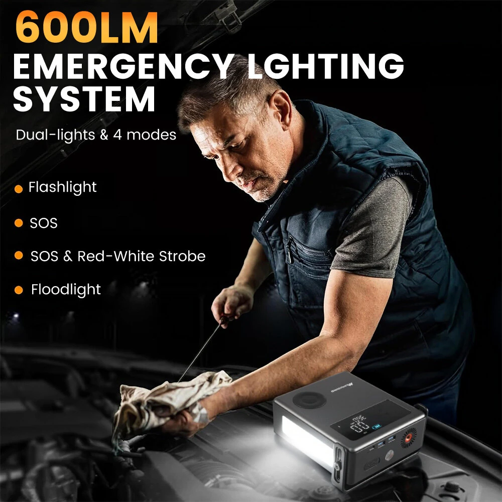 Ha sötétben, út szélén kell intézkedni, a 600 lumenes, két LED-es vészvilágítás valódi segítség. Négy üzemmód közül választhatsz – folyamatos fény, villogás, SOS és stroboszkóp –, így nemcsak látsz, hanem látható is maradsz. A masszív, mégis kompakt ház kényelmes fogantyút kapott, a csomag pedig tényleg teljes: kompresszortömlő tartalékkal, fúvókák, intelligens bikakábel, Type-C töltőkábel, tárolótáska és kézikönyv is jár hozzá. Nem kell külön vásárolni semmit, minden adott ahhoz, hogy bárhol helyzetbe hozd magad.
