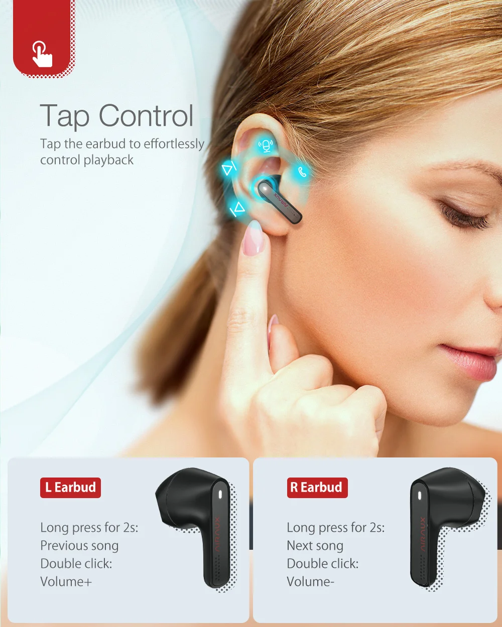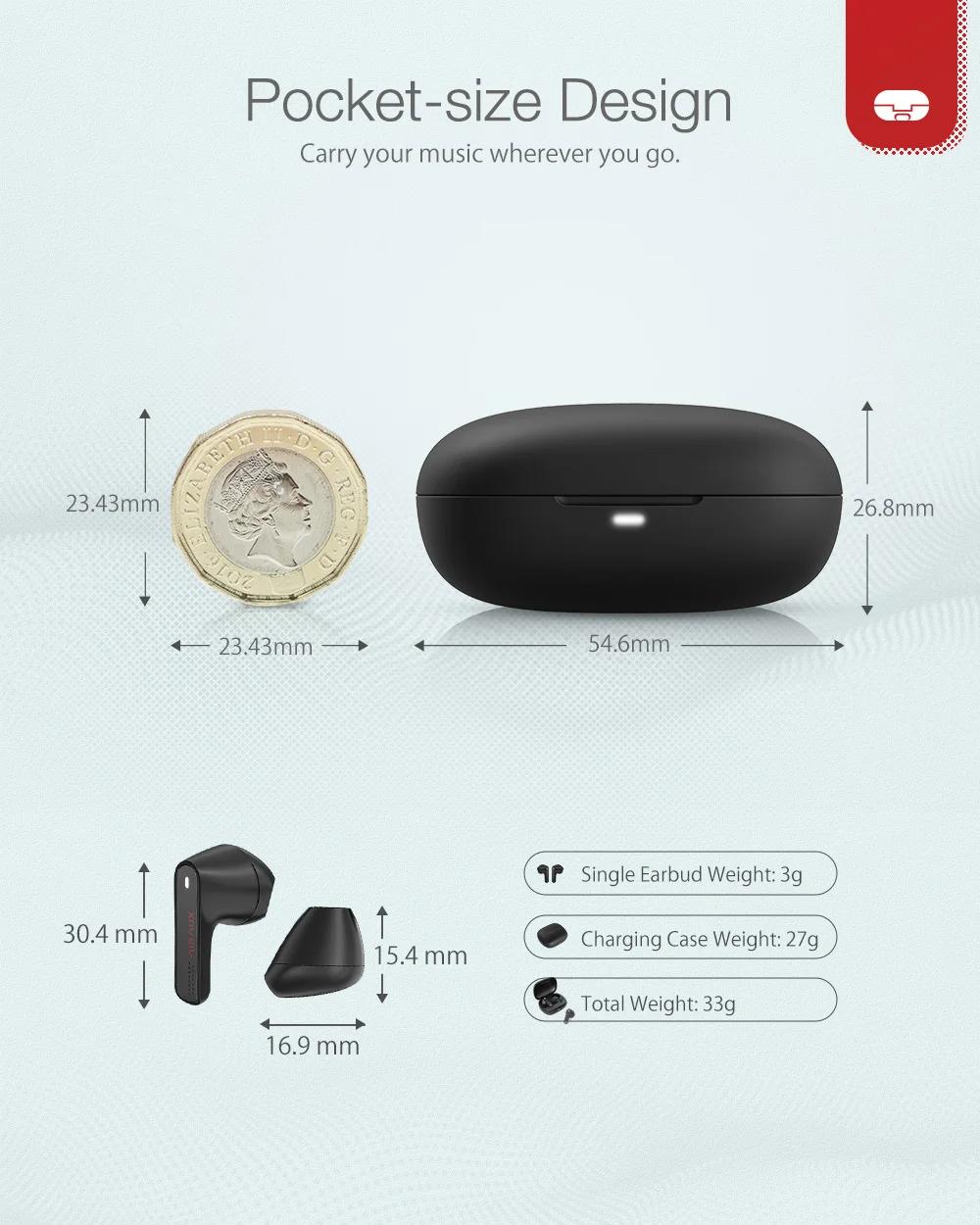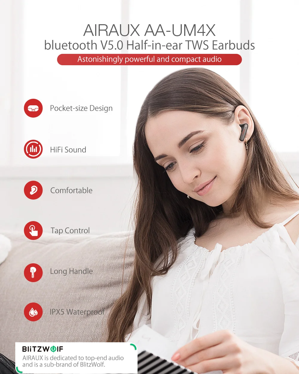 A BlitzWolf Airaux AA-UM4X egy half in-ear kialakítású, vezeték nélküli fülhallgató. A fülesek mindössze 30,4 milliméter hosszúak, tömegük pedig csupán 3 gramm. A bölcső a szokásos, letisztult dizájnt kapta, amiben egy 320 mAh-s akkumulátor található, ezt pedig Type-C kábel segítségével tölthetitek. A tokkal négyszer tudjátok feltölteni a füleseket, melyekkel akár 3 órán át hallgathatjátok kedvenc számaitokat 60%-kos hangerő mellett.