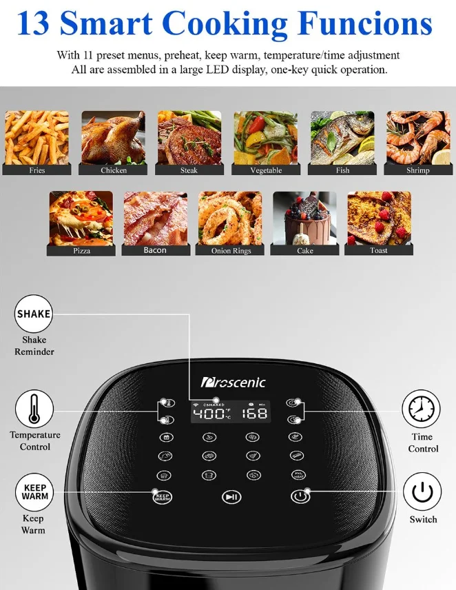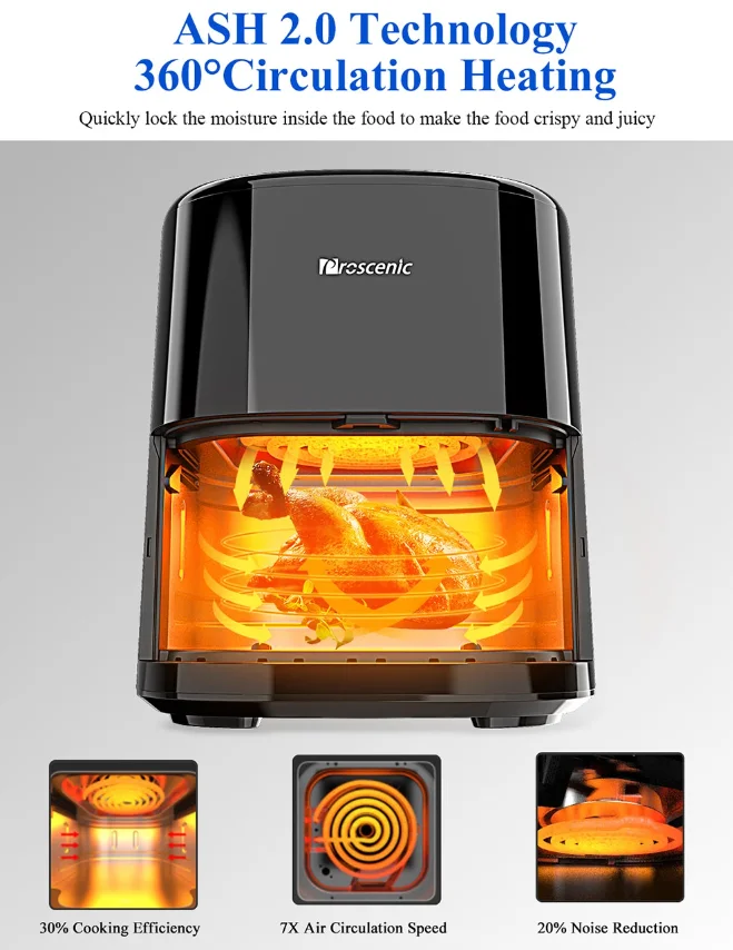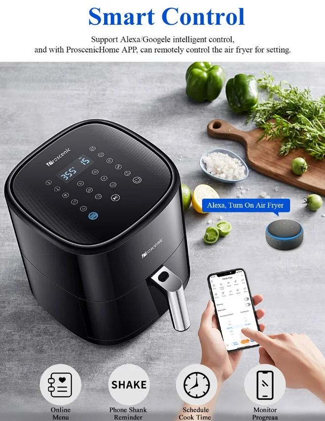 A Proscenic T22 forrólevegős fritőz kiváló választás kisebb konyhába, nyaralóba vagy akár még a kollégiumba is, hiszen a készülék mérete 36,1×27,1×30,6 centiméteres. Ennek ellenére kosara 5 literes, ami már átlagon felüli kategóriának számít és ráadásul könnyen szétszedhető, mosogatógépben is tisztítható.