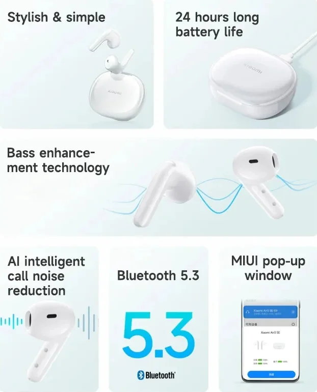A Xiaomi Air 3 SE ideális választás azok számára, akik kedvező árú és jó tudású TWS fülhallgatót keresnek. Bluetooth 5.3 kapcsolattal rendelkezik, amely stabil kapcsolatot és minimális adatvesztést garantál. Egyik nagy előnye, hogy a tok megnyitásakor automatikusan csatlakozik a telefonhoz, és ha friss MIUI rendszert használó telefonotok van, akkor a sikeres csatlakozást egy felugró ablak is igazolja. AI alapú zajszűrést alkalmaz, amely különösen telefonáláskor válik előnyössé, mivel segítségével a fülhallgató csökkenti a háttérzajt, így a beszélgetőpartner tisztán hallhatja a felhasználót.