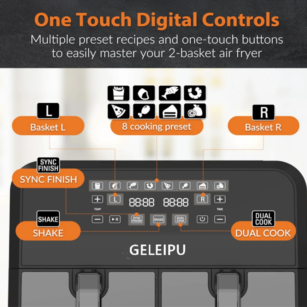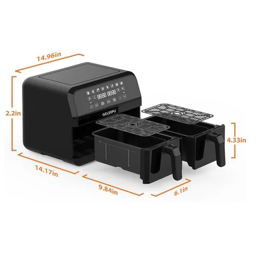 Az alábbi gép 1700 W teljesítményű, az érintőpaneljén állítható az idő 1 és 60 perc között és a hőfok 90 és 180 fok között, de hatféle előre beállított sütési móddal is rendelkezik, amelyek tökéletesek különféle ételek elkészítéséhez, a ropogós krumplitól a csirkeszárnyakig. Amikor a sütés a vége fele jár, akkor csipog a gép, hogy opcionálisan forgassuk meg a készülő ételt. A kosarak tapadásmentesek és mosogatógépben moshatók, így a tisztítás nem okoz gondot.