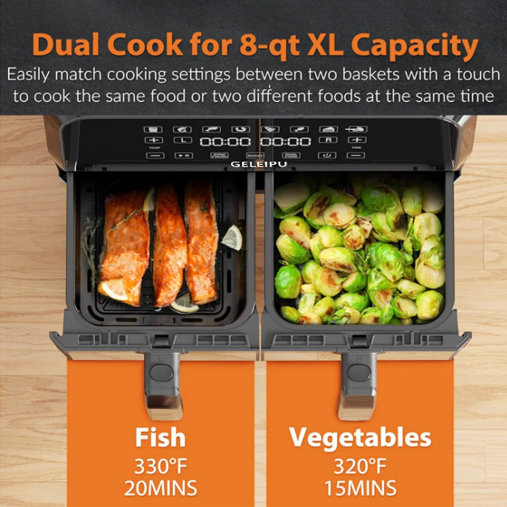 A Geleipu D28 az egyik legolcsóbb olyan air fryer a piacon, ami két kosárral rendelkezik. Ezek egyenként kicsit kevesebb, mint 4 liter űrtartalmúak, összesen 7,5 liter étel fér a gépbe. Jóval nagyobb, mint egy hagyományos sütő, illetve nagyszerű benne, hogy a Sync Finish technológia lehetővé teszi, hogy egyszerre kétféle étel készüljön különböző képpen, eltérő idő- és hőmérséklet beállításokkal, de mégis ugyanakkor készül el mindkét fogás. A duplakosaras kialakításnak két fő előnye van az air fryerek esetében. Ha nem kell nagy adagot készíteni, akkor arra használható, hogy a két rekeszben egyszerre más és más étel készüljön. Ha viszont a mennyiségre esik a hangsúly, mert mondjuk egy 4-5 fős családra kell főzni, akkor ugyanaz is belekerülhet, és akkor a nagyobb kapacitás a fő erénye.