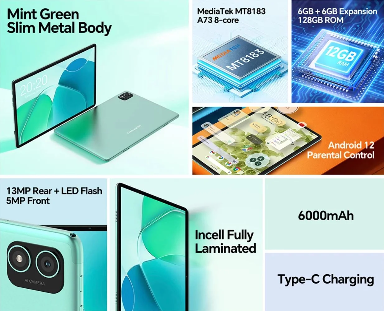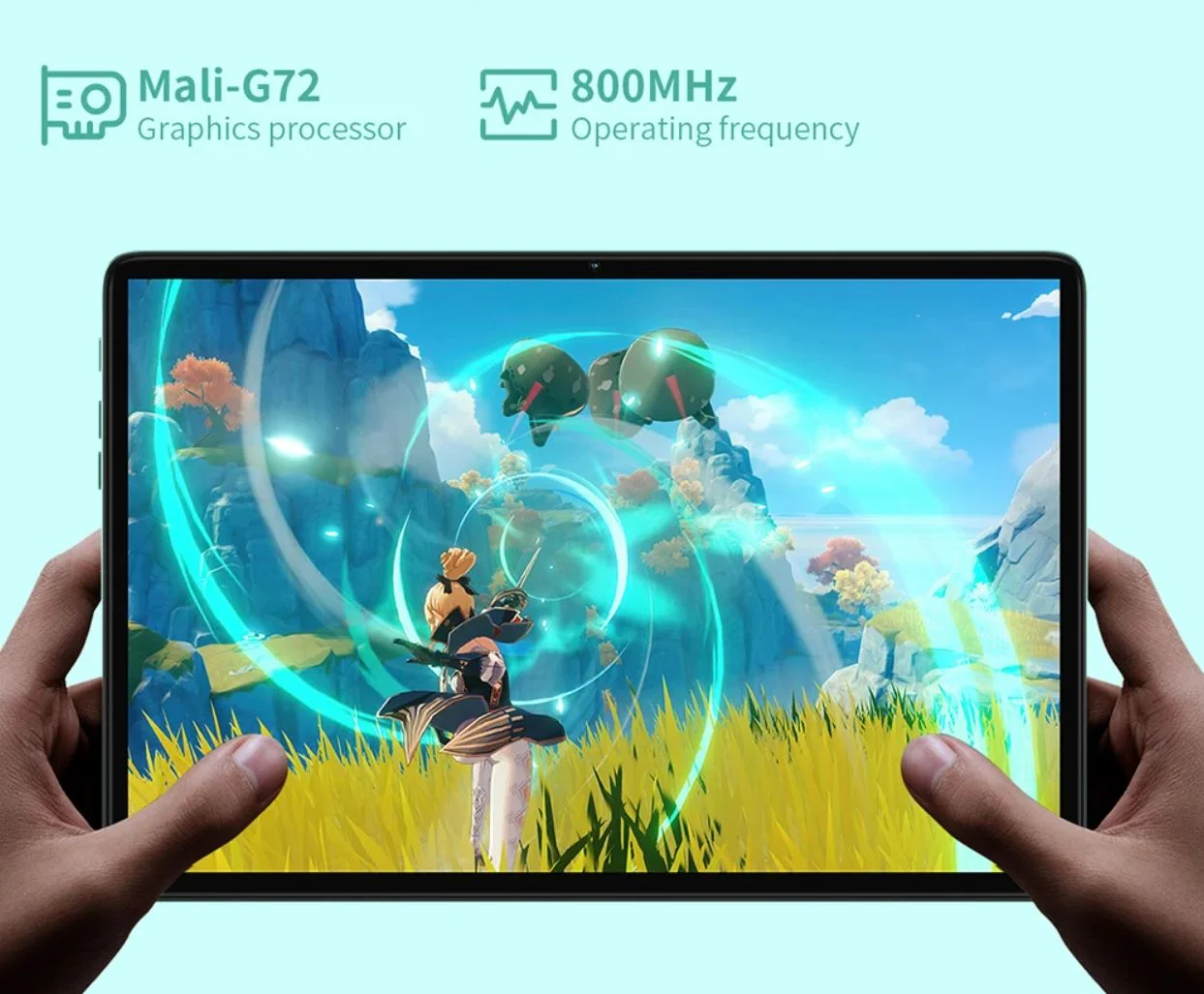 A 6000 mAh-s akkumulátor hosszú üzemidőt biztosít, így akár egész nap használhatjuk anélkül, hogy aggódni kellene a töltés miatt. A tablet USB Type-C porton keresztül tölthető, emellett az OTG-támogatásnak köszönhetően más eszközöket is csatlakoztathatunk hozzá.