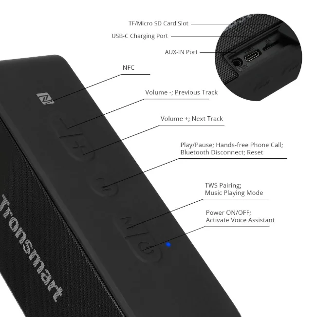 Természetesen támogatja a TWS módot, ezáltal sztereóban hallgathatjátok kedvenc számaitokat, dupla akkora teljesítménnyel. 3600 mAh-s akkut pakoltak bele, ami 24 órás üzemidőt biztosít a készülék számára. Az aksit Type-C porton keresztül tudjátok tölteni, amihez a gyártó mellékeli a kábelt is a csomagban. Az egyszerűbb párosítás érdekében NFC chippel is ellátták, melyet a készülék tetején, a vezérlőgombok mellett találtok.