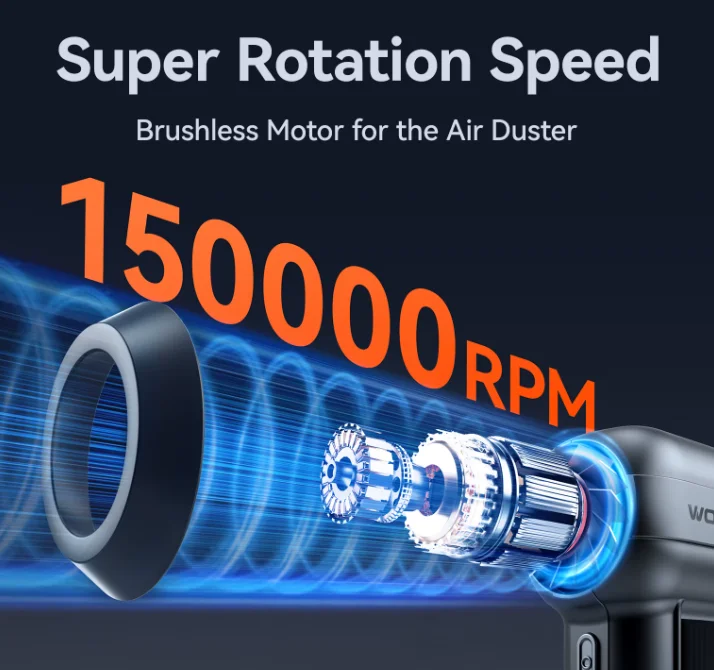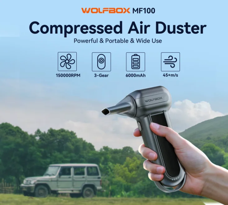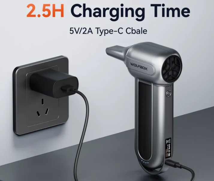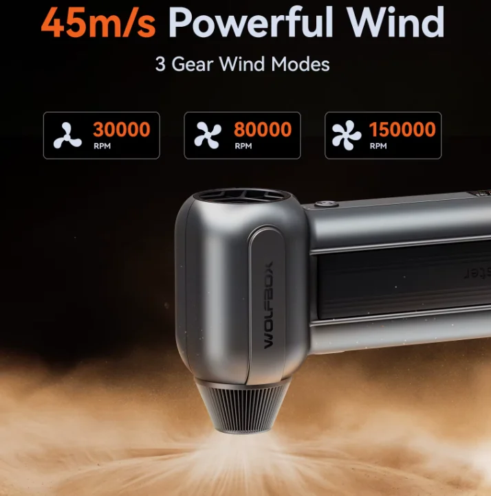 A WOLFBOX MF100 lelke egy nagy teljesítményű kefementes motor, amely három fokozatban működik: 30 000, 80 000 és 150 000 RPM. A maximális sebességnél 45 m/s légáramlást produkál, ami olyan, mintha egy kisebb vihar költözne a nappalidba. A 6000 mAh kapacitású akkumulátor nem csak papíron erős: akár órákon át használhatod egyetlen töltéssel. Ha lemerül, egy USB Type-C kábellel mindössze 2,5 óra alatt újra teljes erőre kap.