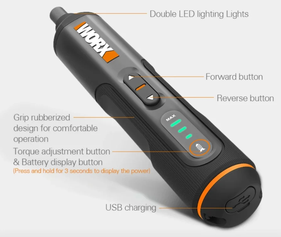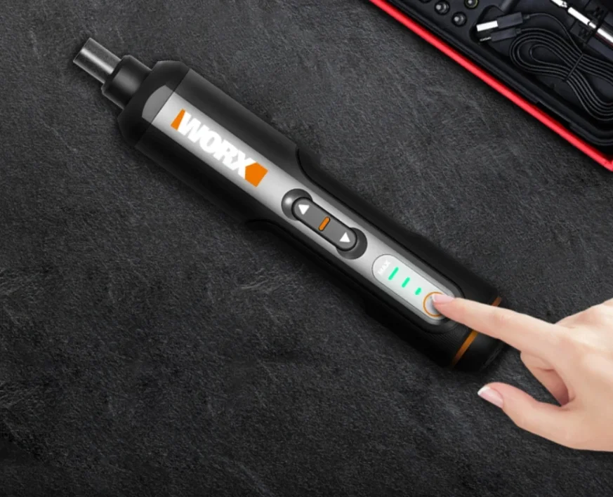 A kütyü egy 4 V-os csavarbehajtó és ebből a katalógusadatból már gondolhatjuk, hogy nem ez a világ legerősebb behajtója, de nem is annak tervezték. Maximum 8 Nm forgatónyomatékra képes, lehatárolni pedig 2,5 és 5 Nm-nél tud. Az akkumulátora 1500 mAh-s, újratölteni pedig Type-C porton keresztül tudjuk. A töltöttségi szintet három LED csík jelzi a szerszám oldalán.