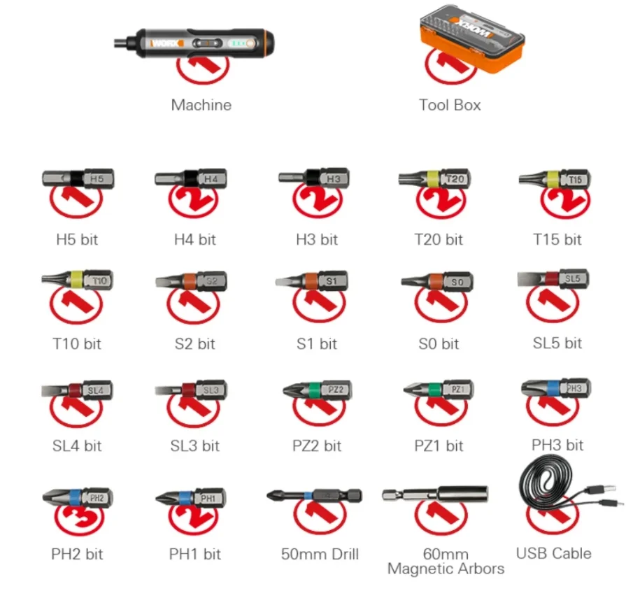 A csavarbehajtó egy minőségi tárolódobozzal rendelkezik, ebben lehet elhelyezni a gépet és a hozzá adott 26 darab bitfejet.