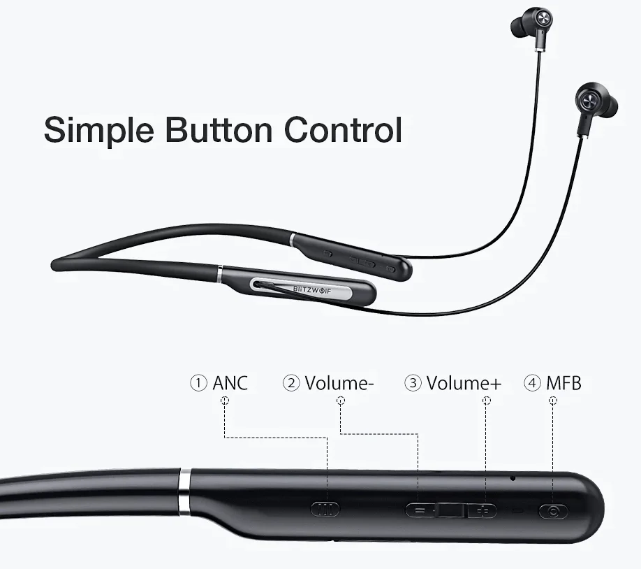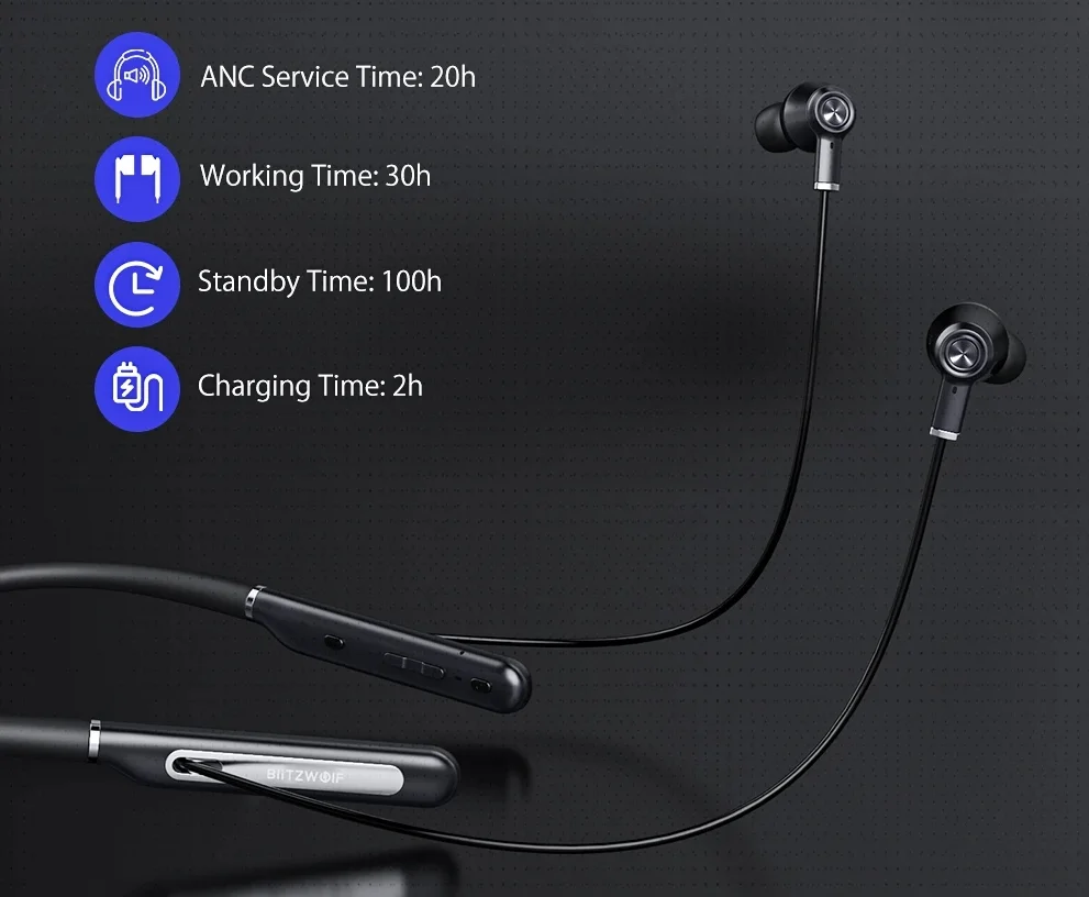 A BlitzWolf egyik olcsó aktív zajszűréssel szerelt fülese a BW-ANC2. Ez a technológia nem olcsó, így a belépőszinten igen ritka a megjelenése. Többek között azért lehet ilyen kedvező az ára, mert nem TWS, hanem nyakpántos a kialakítása. Ennek viszont több előnye is van, például „hatalmas”, 200 mAh-s akkumulátor fért bele, amivel közepes hangerőn 30 órát tud üzemelni. Újratölteni Type-C porton keresztül lehet. További jó tulajdonsága, hogy a mikrofon is közelebb van a sancho, így tisztább hangzást lehet vele elérni telefonálásoknál.